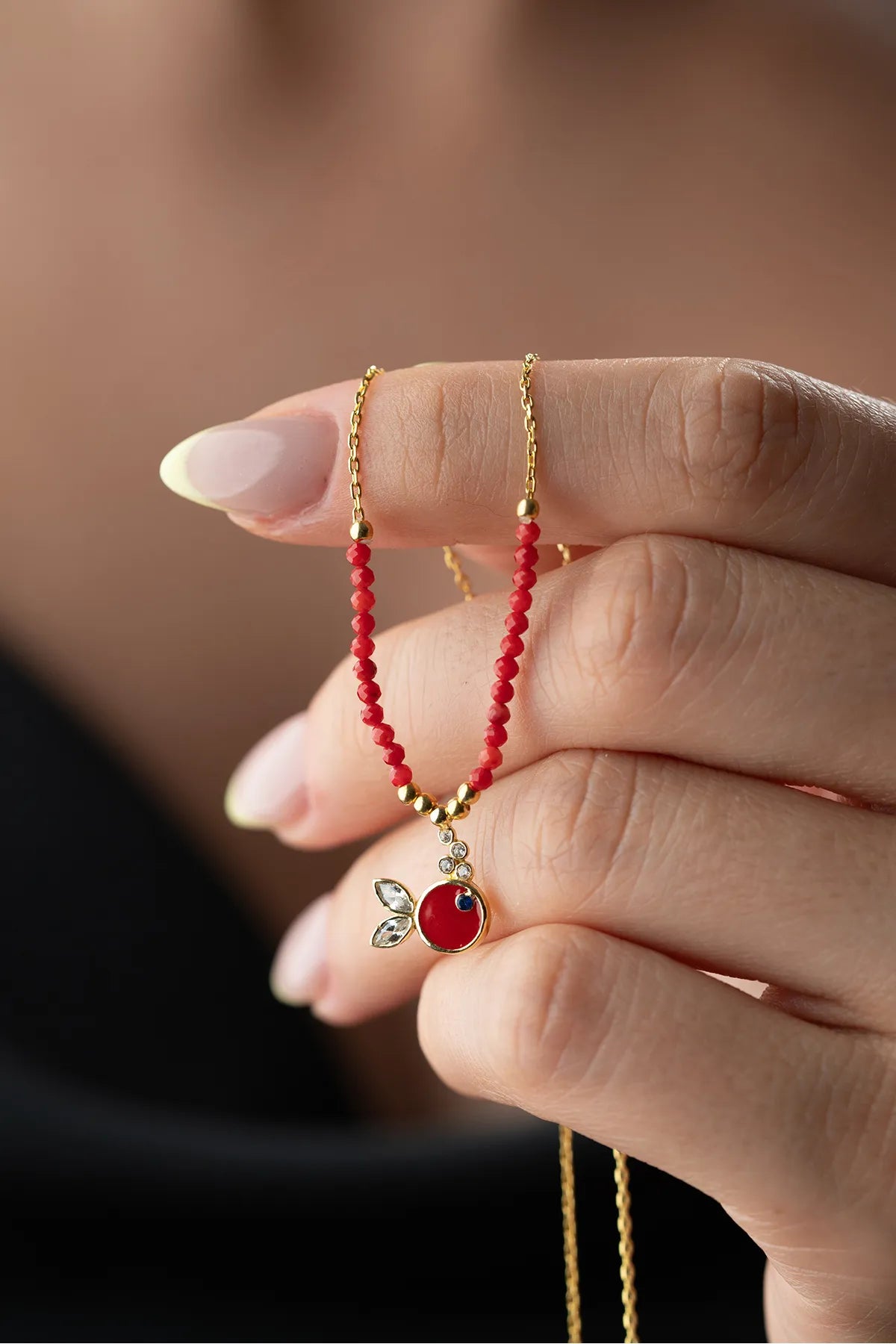 Canlı kırmızı tonları ve sevimli balık figürüyle dikkat çeken bu kolye, 925 ayar gümüşten üretilmiştir. Mineli detaylar ve boncuklu tasarımı ile stilinize enerjik bir dokunuş katar. Günlük kullanım için şık ve modern bir tercihtir.