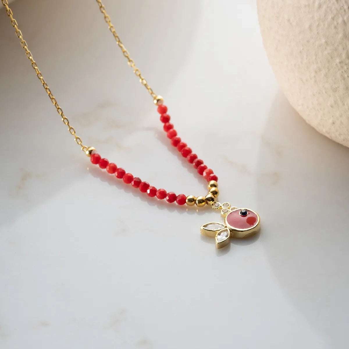 925 Ayar Gümüş Boncuklu Kırmızı Mineli Balık Kolye