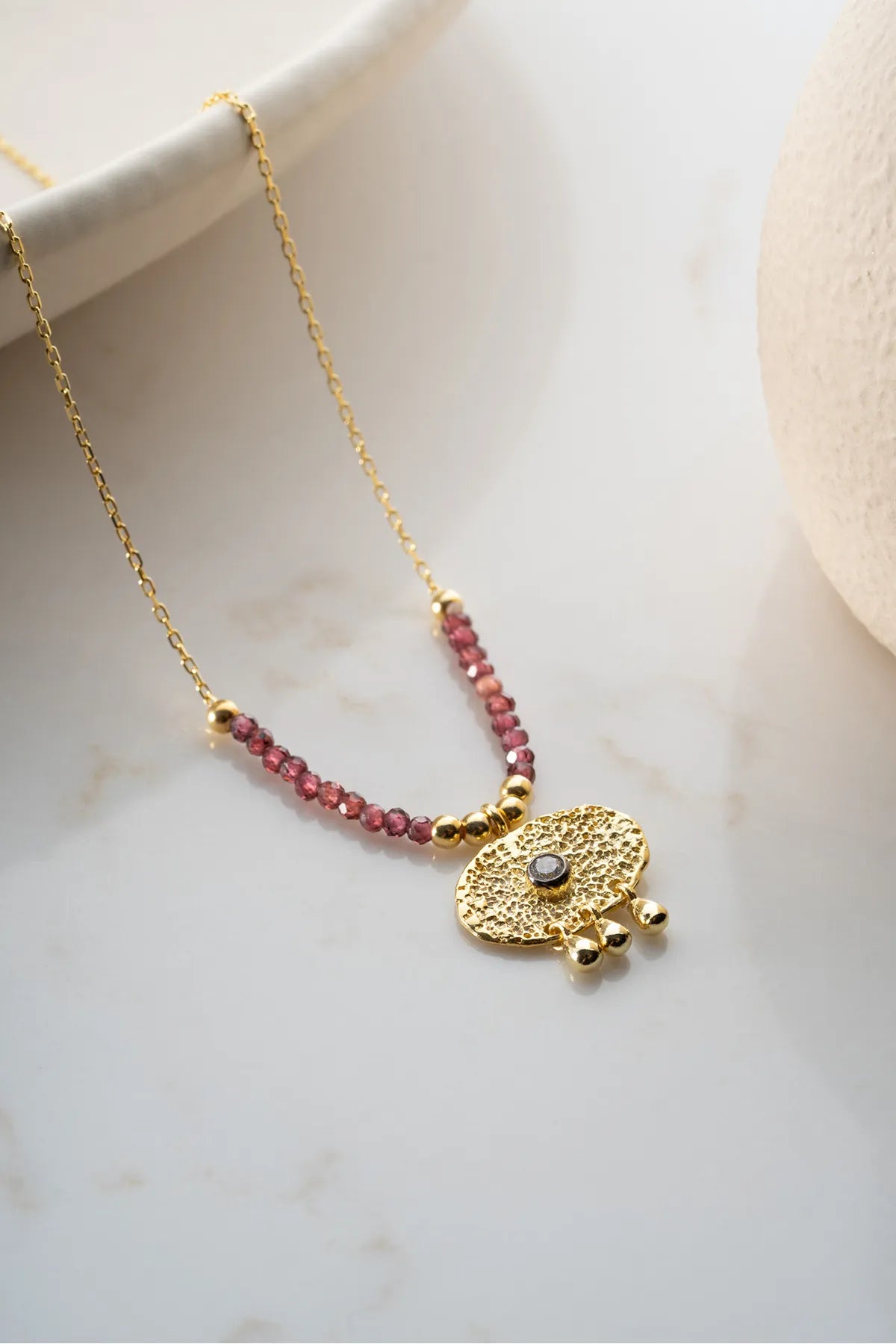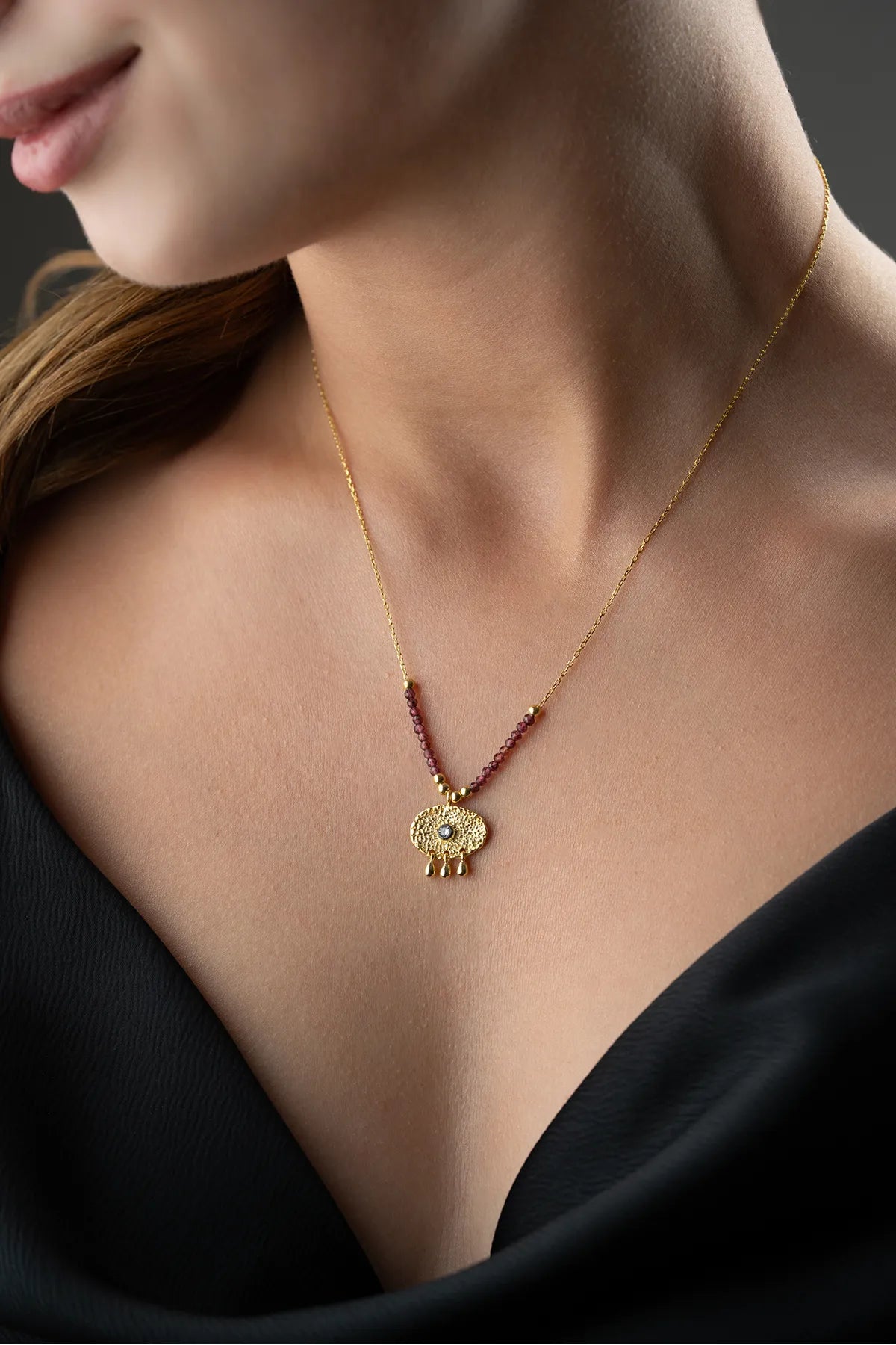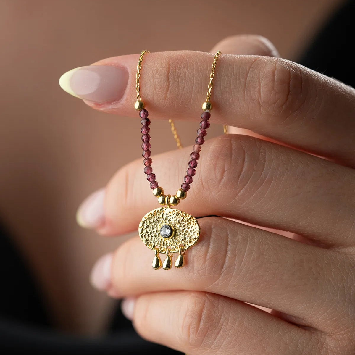 Geleneksel Süryani kültüründen esinlenen bu anlamlı kolye, 925 ayar gümüşten üretilmiştir. Kırmızı tonlardaki boncuk dizilimi ve taş detaylı süsleme ile hem zarif hem de dikkat çekici bir tasarım sunar. Anlam yüklü, özel bir aksesuar tercihidir.