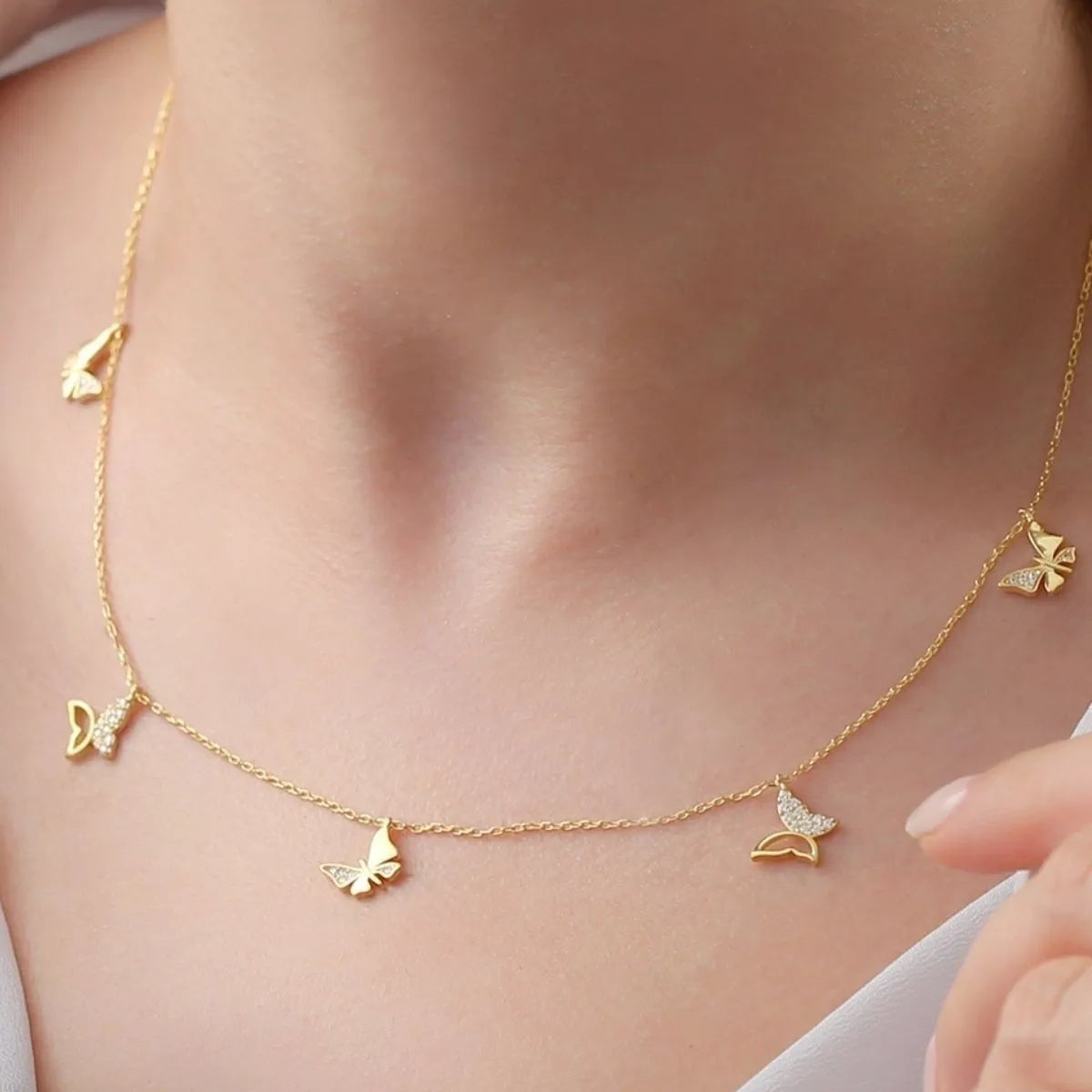 Altın kaplama zarif kelebek figürleriyle tasarlanan Gold Kelebek 925 Ayar Gümüş Şans Kolye, hafif ışıltısıyla zarafeti ve şansı bir araya getiriyor.