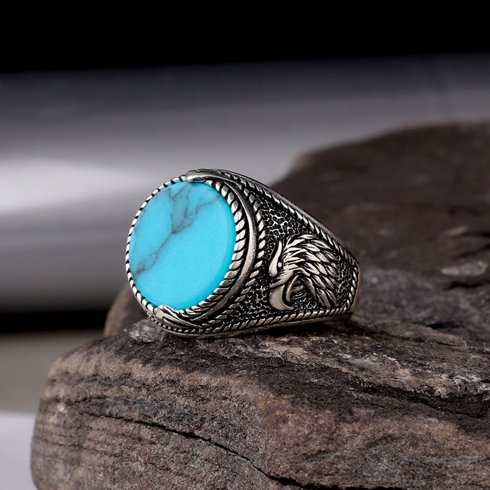 Doğallığın ve özgürlüğün simgesi turkuaz taş ile işlenmiş kartal motifli erkek yüzüğü.