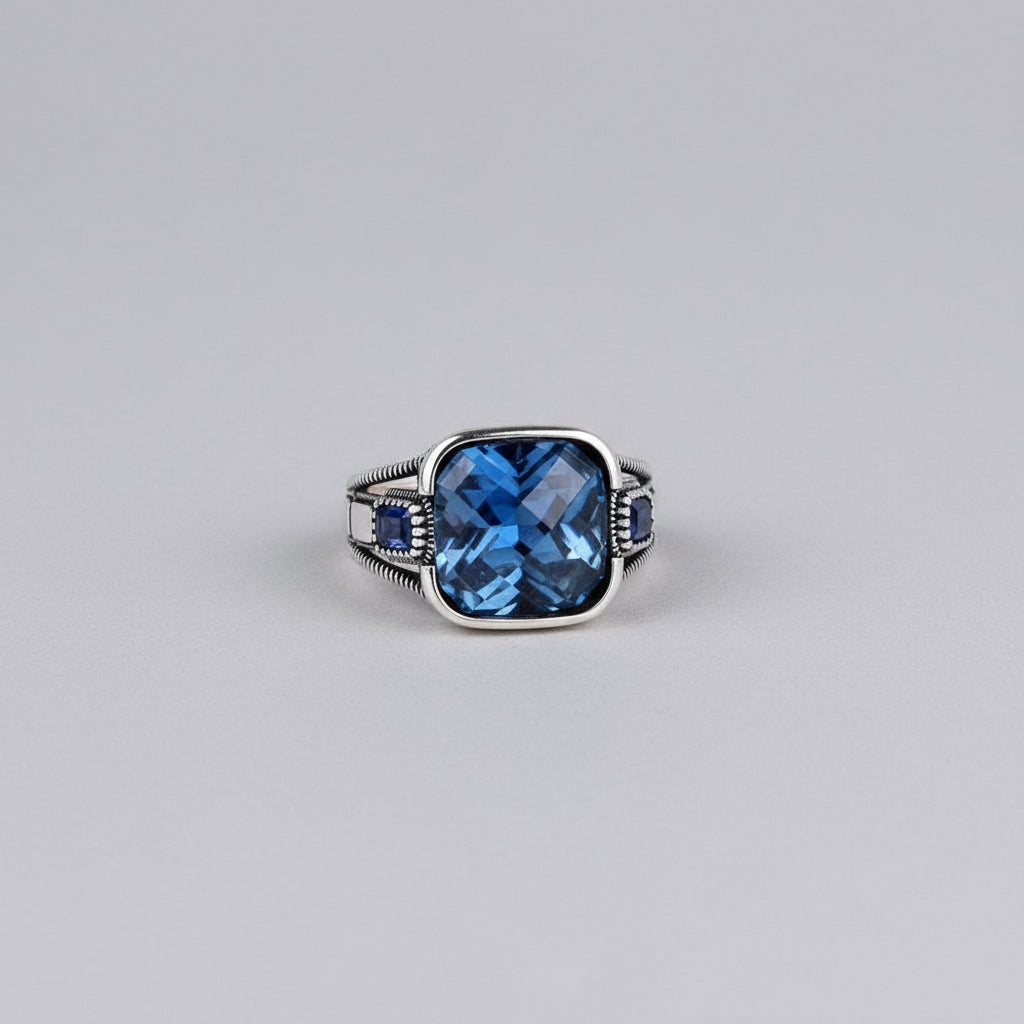 Göz alıcı mavi taşlı ve zarif detaylı 925 ayar gümüş erkek yüzük.