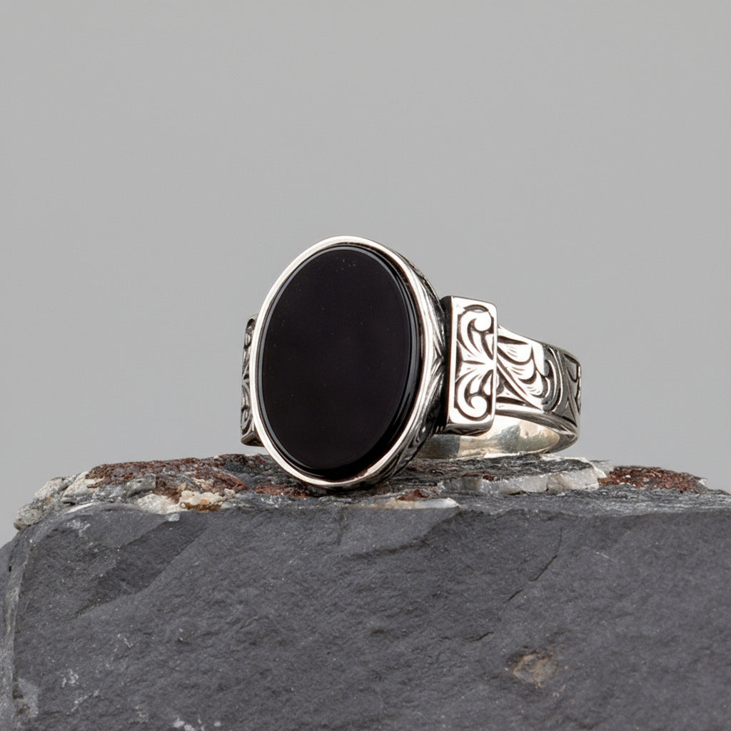 Siyah oniks taş detaylı, 925 ayar gümüşten üretilmiş otantik erkek yüzüğü.