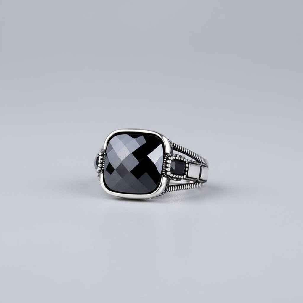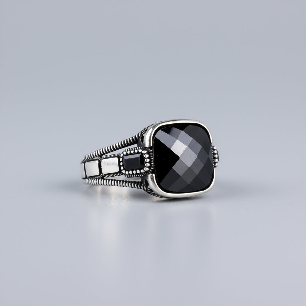 Güçlü ve şık görünümüyle dikkat çeken siyah taşlı 925 ayar gümüş erkek yüzük.