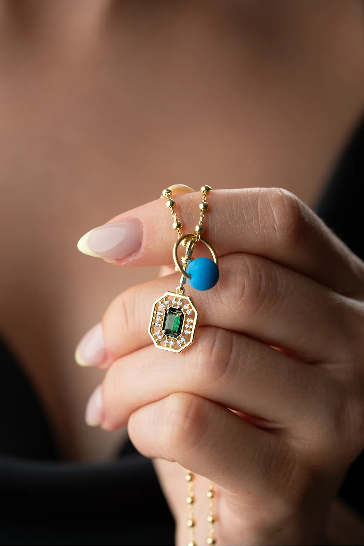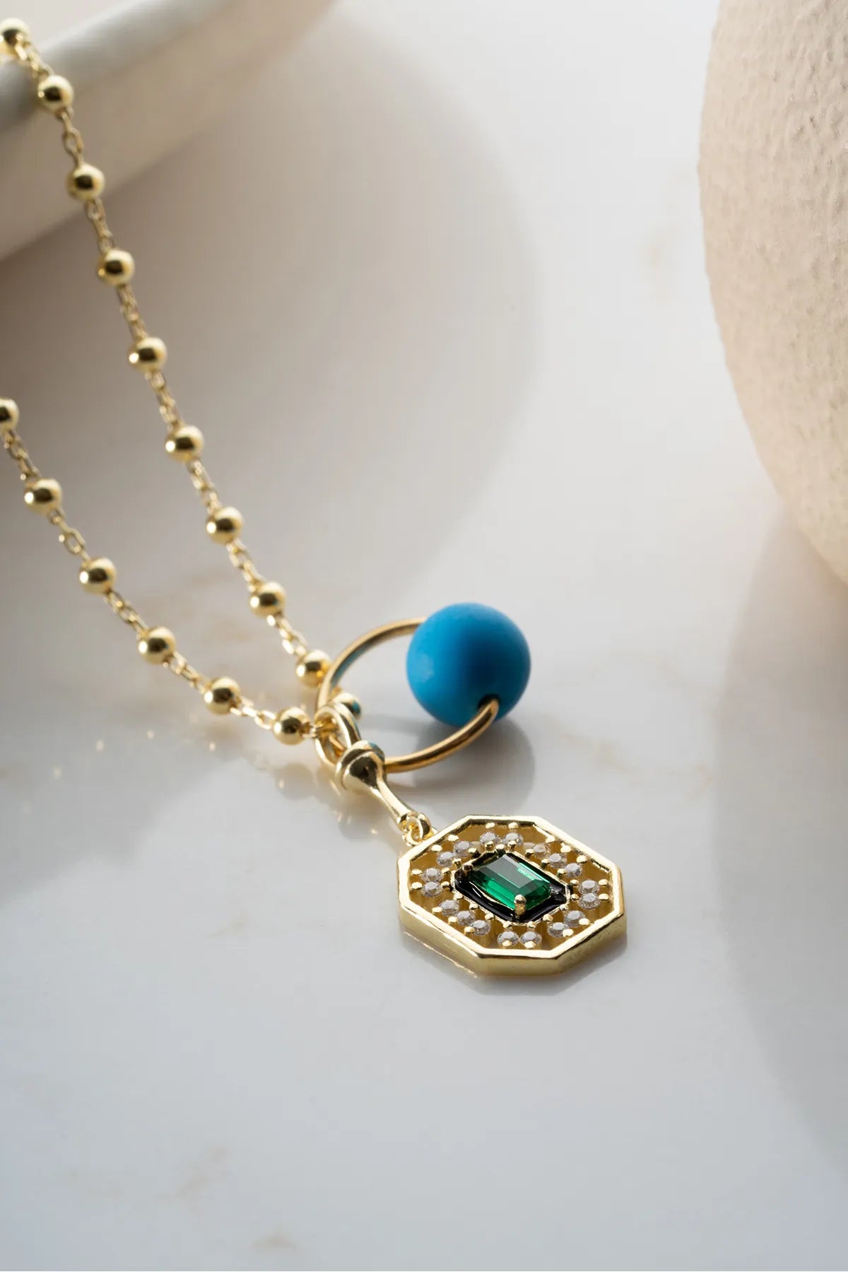 Göz alıcı yeşil baget taşı ve detaylı tasarımıyla öne çıkan bu şans kolyesi, 925 ayar gümüşten üretilmiştir. Altın kaplama zinciri ve zarif boncuk dokunuşları ile günlük stilinize ışıltı katar.