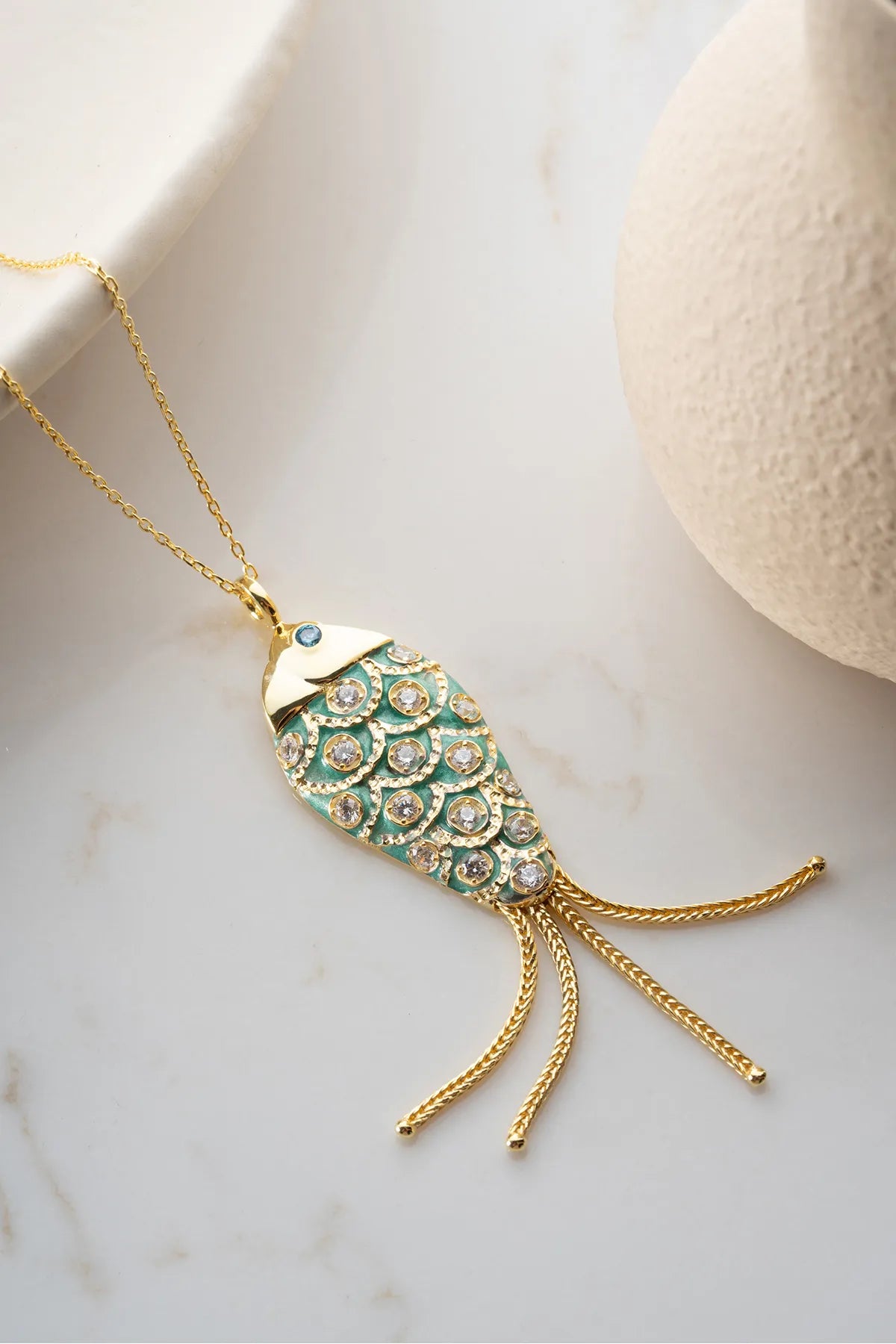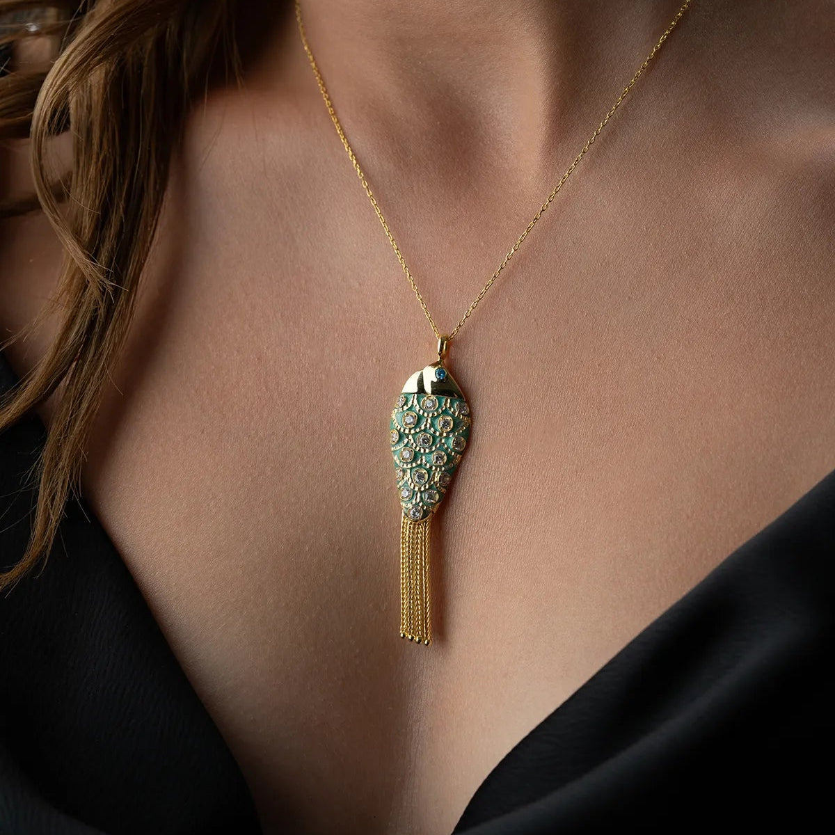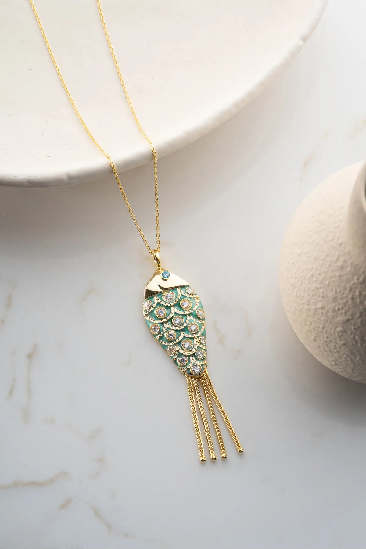 Işıltılı taş detayları ve püsküllü zincir tasarımıyla dikkat çeken bu balık kolye, 925 ayar gümüşten üretilmiştir. Altın kaplama ve özel işçiliğiyle zarafeti temsil eder. Hem günlük kombinlerde hem de özel günlerde kullanıma uygundur.
