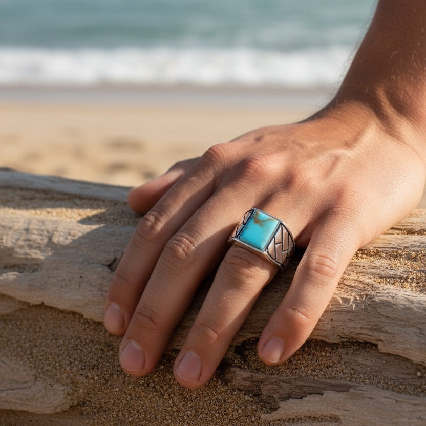 Eleganter Herrenring aus 925 Sterling Silber mit natürlichem Türkisstein und modernem geometrischem Design für einen stilvollen und kraftvollen Look.