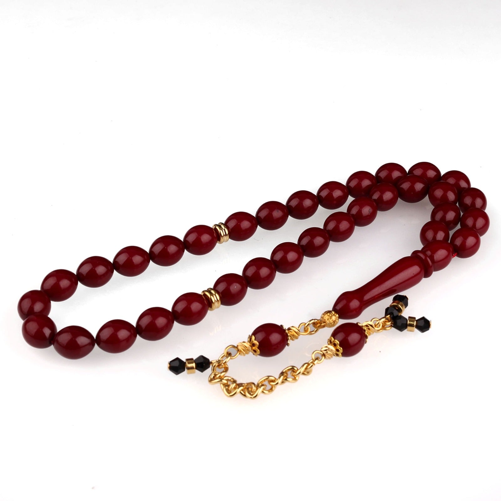 Koyu kırmızı ateş kehribar taneler, gold metal ara parçalar ve siyah detaylı zincir püskül ile şık tesbih. Günlük kullanım ve hediye için ideal.