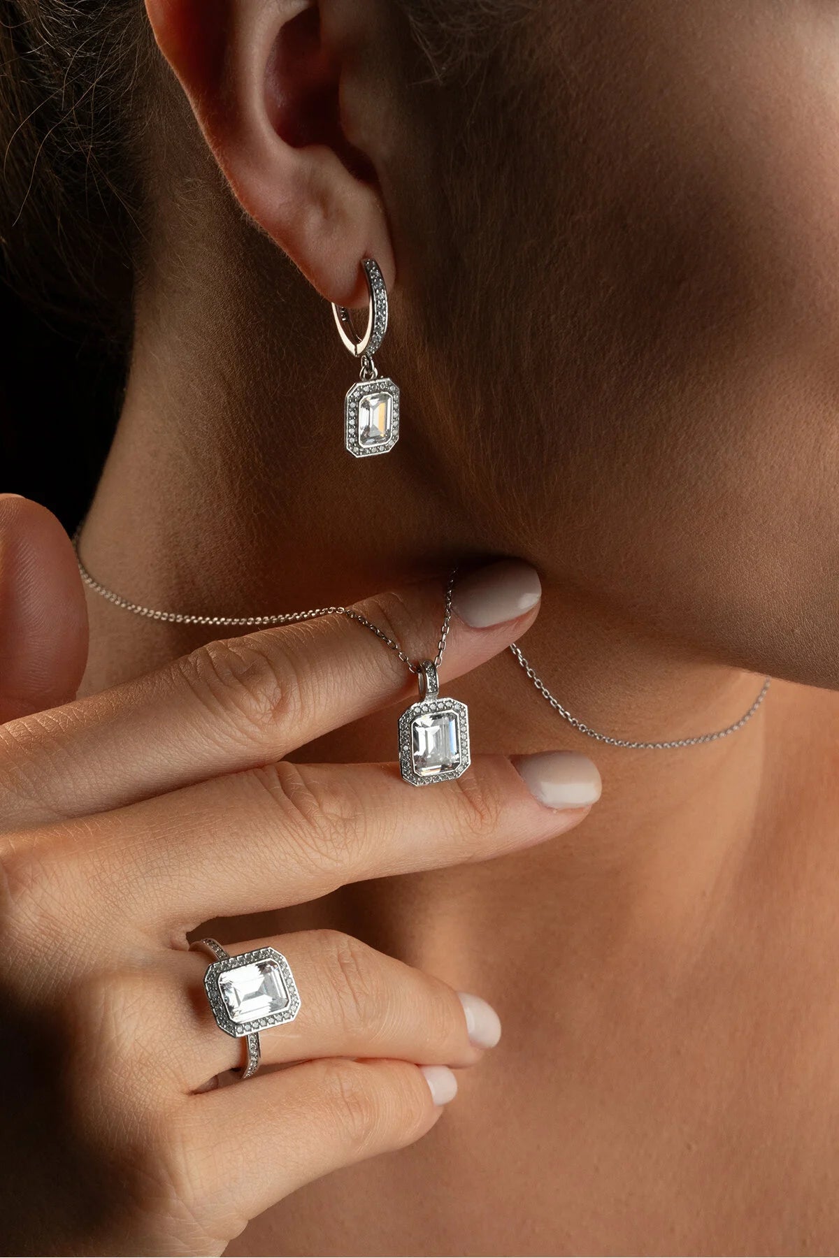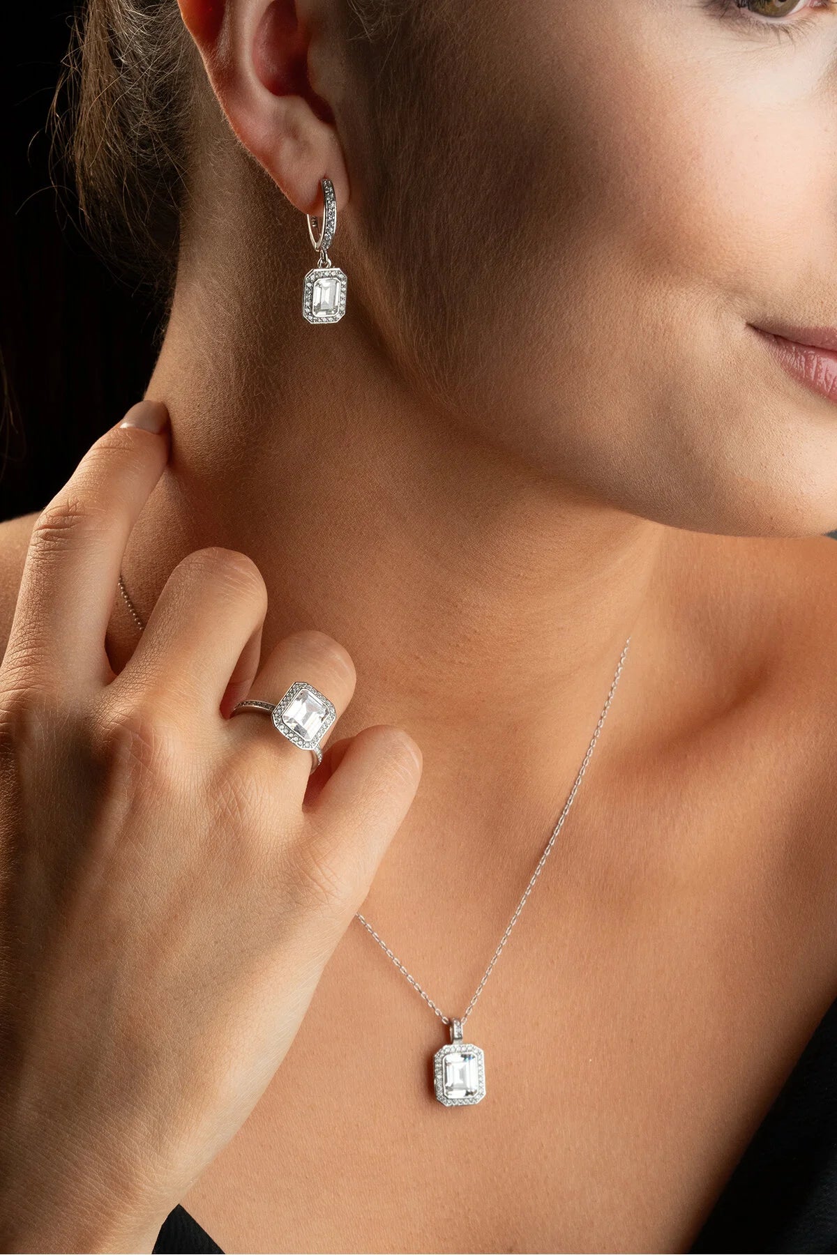925 ayar gümüş, baget kesim taşlı kolye, küpe ve yüzükten oluşan klasik ve zarif set.