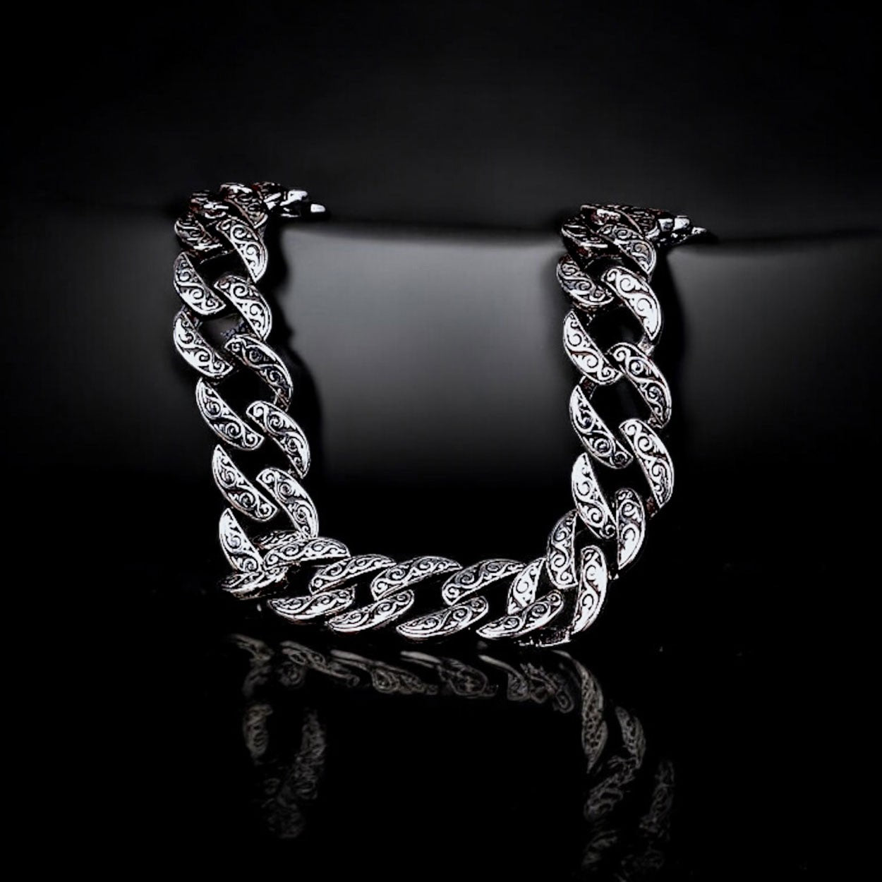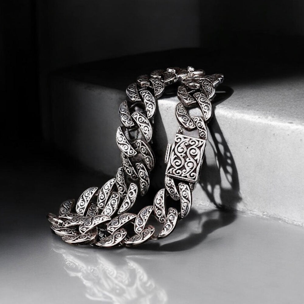 Dieses stilvolle Silberarmband hat eine Perlengröße von 10 mm und eine Gesamtlänge von 22 cm. Mit einem Gewicht von 20 Gramm kombiniert es traditionelle Stickmuster mit moderner Eleganz. Mit seinem einzigartigen Design und der hochwertigen Verarbeitung ist dieses Armband das perfekte Accessoire, um Ihrem Stil Eleganz zu verleihen.