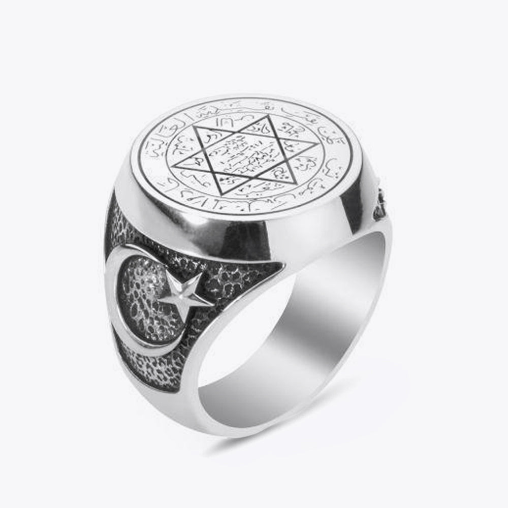 Üzerinde dua ve yıldız tılsım motifli, ay-yıldız ve Osmanlı armalı 925 ayar gümüş erkek yüzük.
