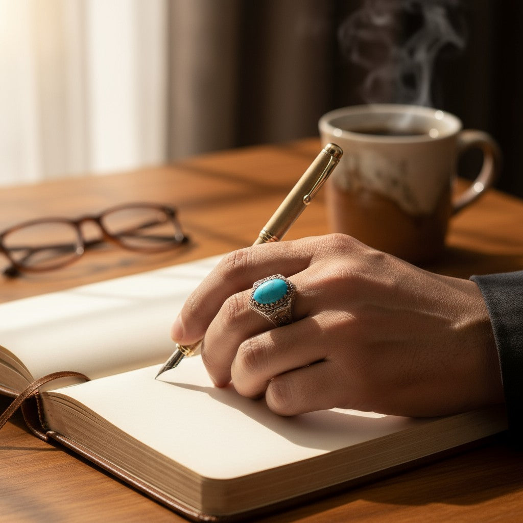 El işçiliği detaylarla bezenmiş bu göz alıcı erkek yüzük, firuze taşının sakinleştirici enerjisini klasik bir formda sunuyor. Geleneksel motiflerle süslenen gövdesi, yüzüğe asil bir duruş kazandırıyor. Günlük kullanım ve özel günlerde stilinizi tamamlamak için mükemmel bir tercihtir.