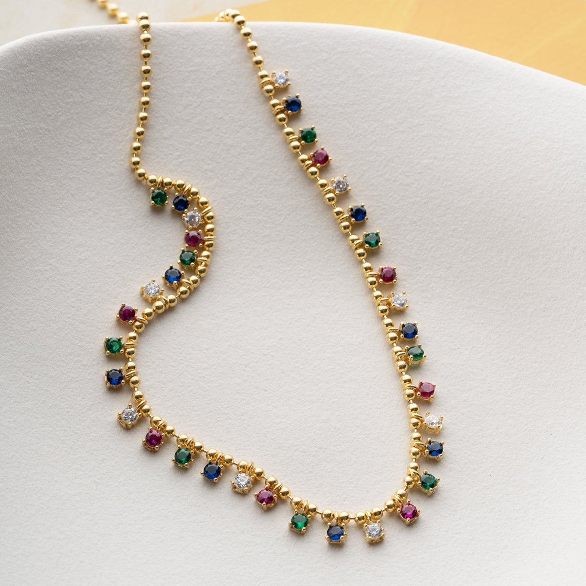 Die Serenay Halskette aus vergoldetem Silber mit farbigen Steinen verleiht jedem Look Eleganz und Lebendigkeit. Ideal für den Alltag und besondere Momente.
