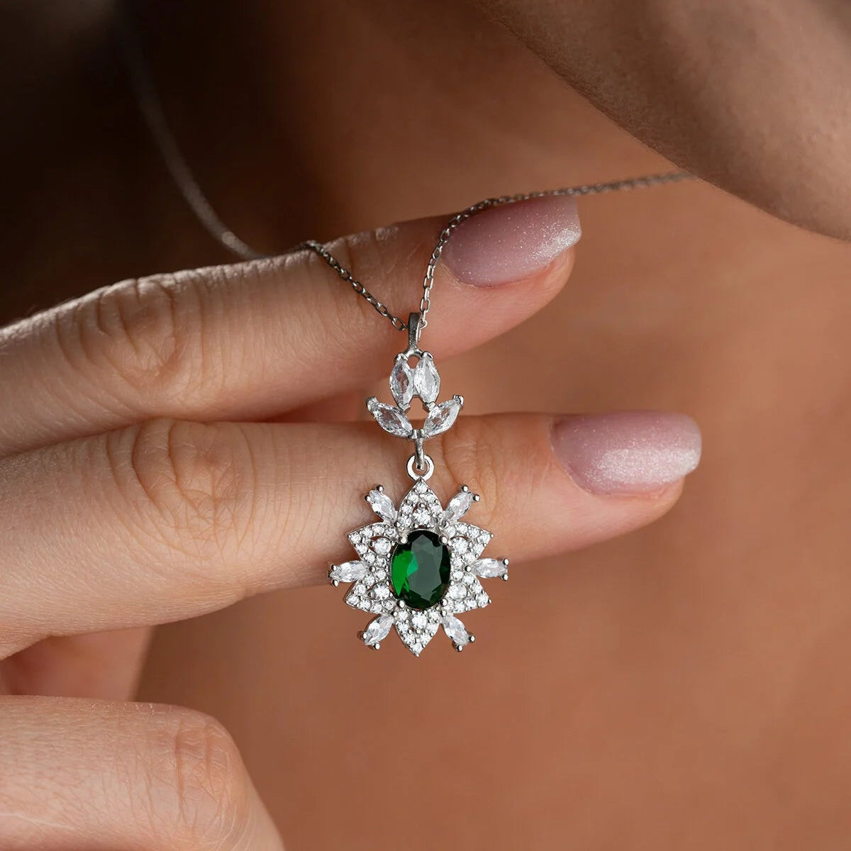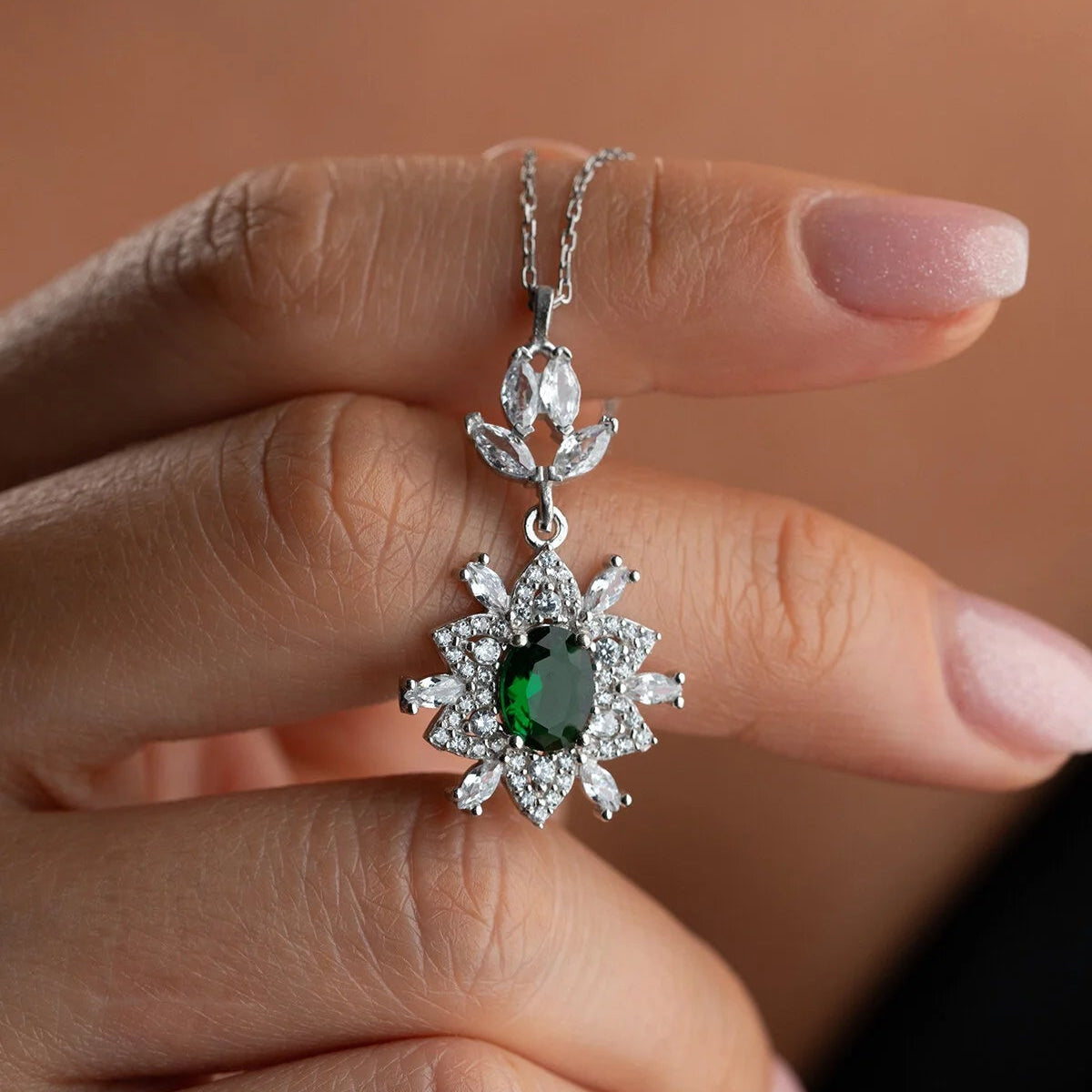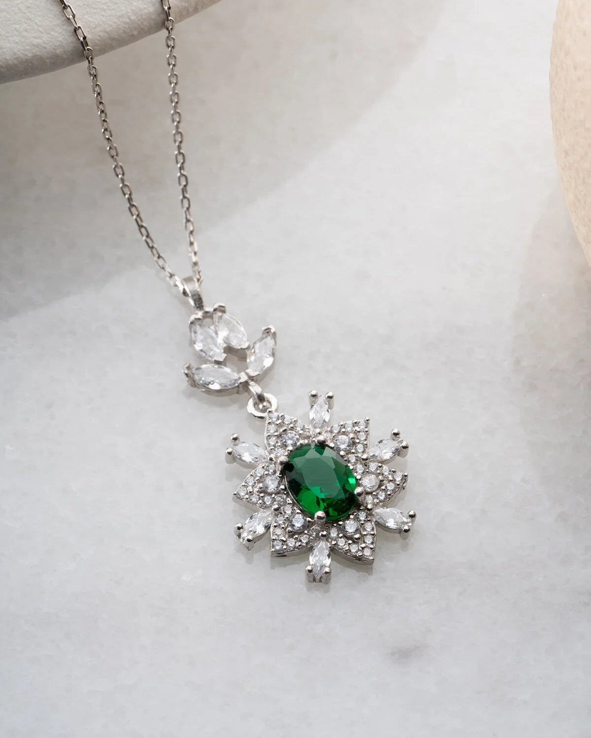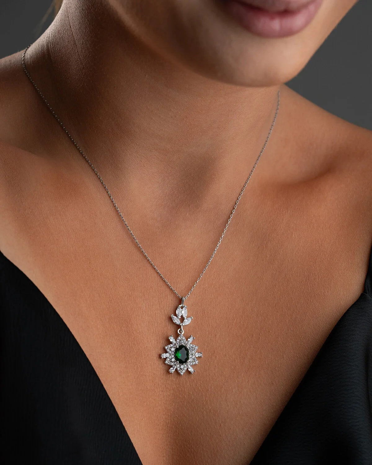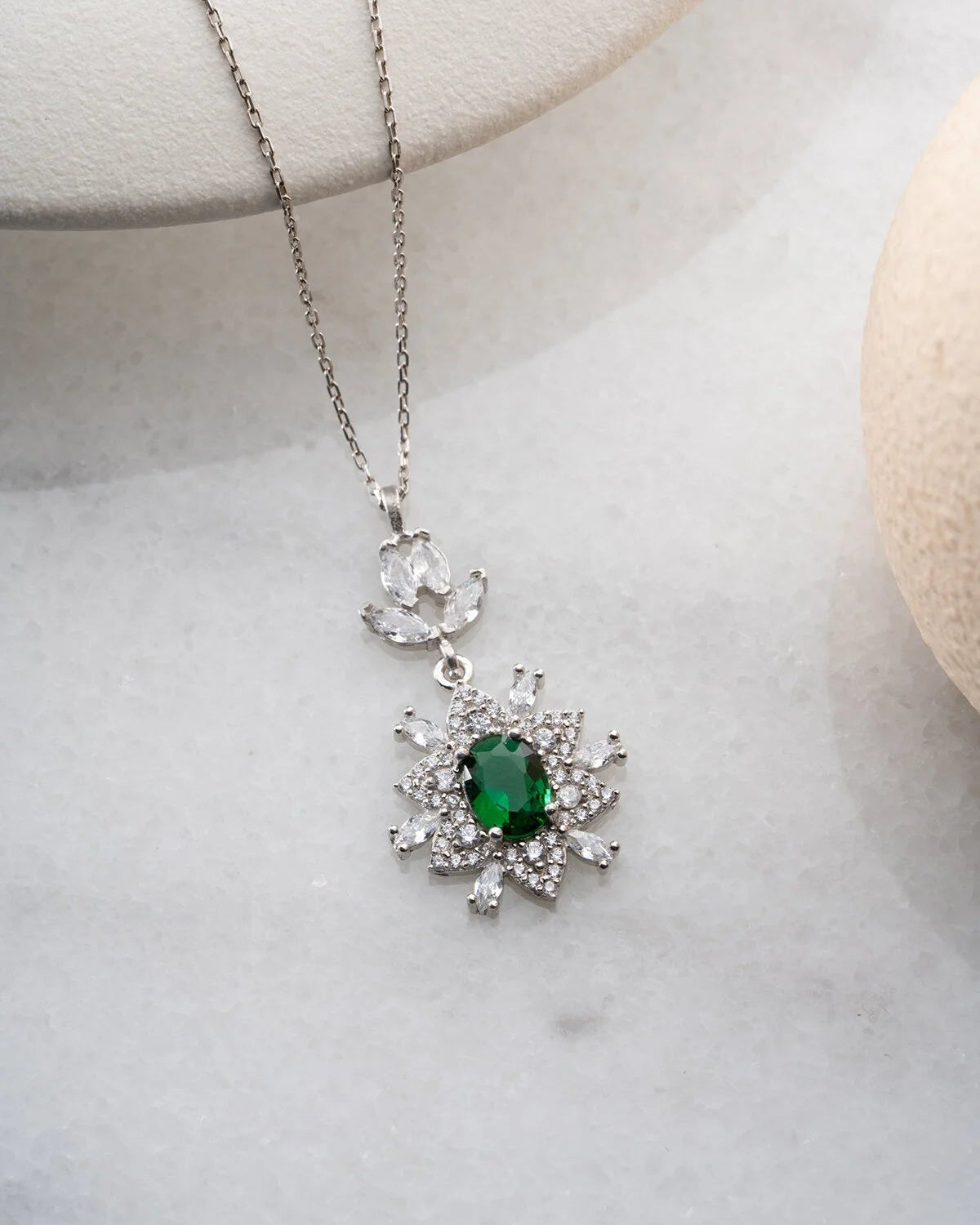 Trendige Halskette aus 925er Silber mit smaragdgrünem Mittelstein und funkelnden Zirkon-Details. Perfekt für Alltag und besondere Anlässe.