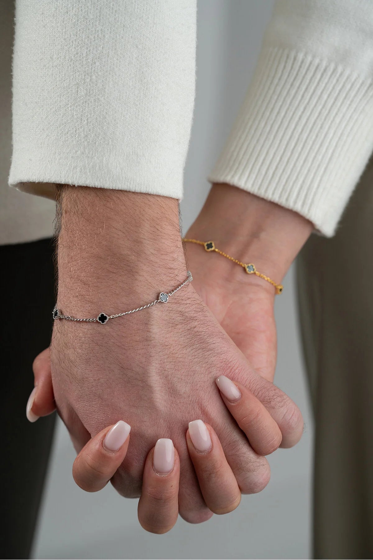 Zarif tasarımlı altın ve gümüş renklerde çiftlere özel yonca bileklik modeli.