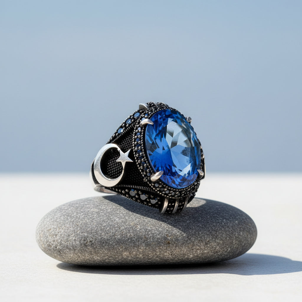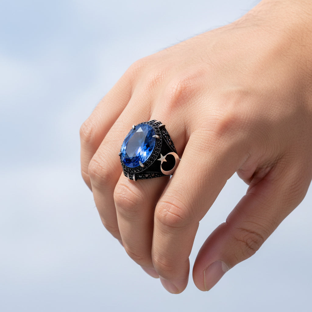 Derin lacivert zirkon taşın ışıltısıyla göz kamaştıran, 925 ayar gümüşten üretilmiş özel tasarım erkek yüzük.