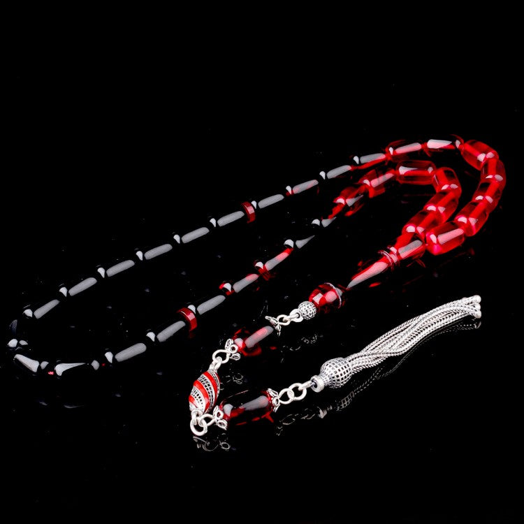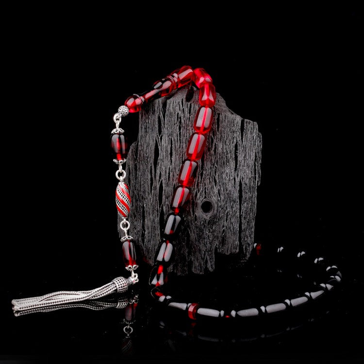 Kırmızı-siyah renkli süzme kapsül kesim, mineli püsküllü ateş kehribar tesbih.