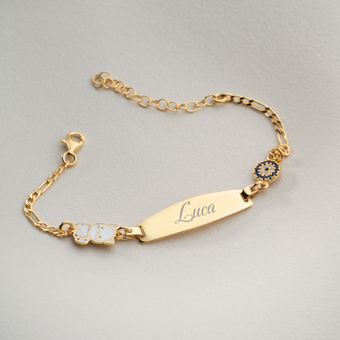 A delightful kids bracelet made of 925 sterling silver, featuring a cute enamel cat charm and customizable name engraving.