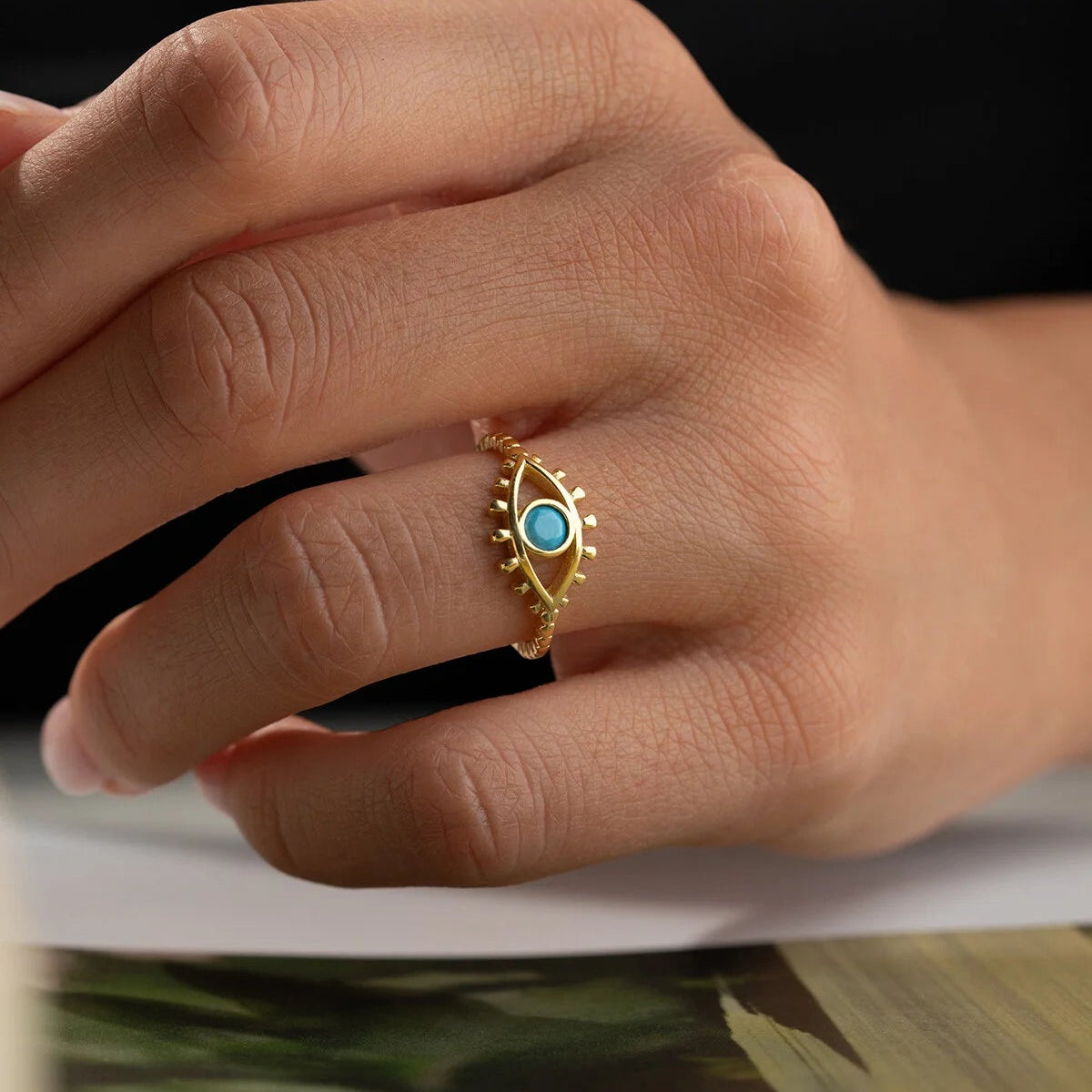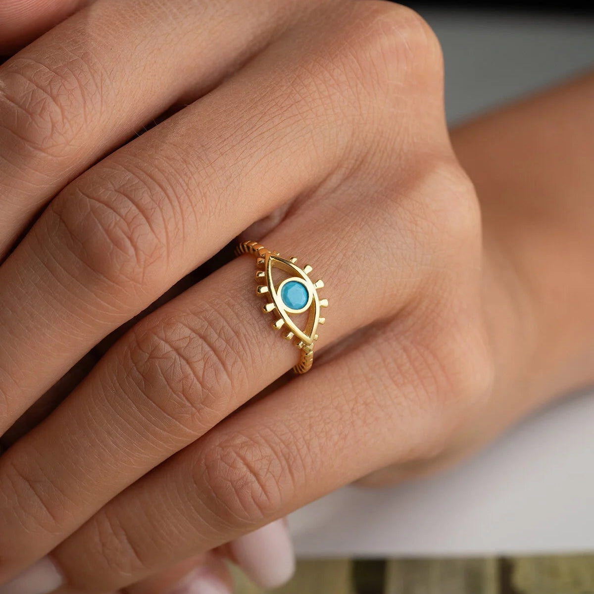 Modern tasarımlı, nazar boncuğu detaylı 925 ayar gümüş altın kaplama yüzük.