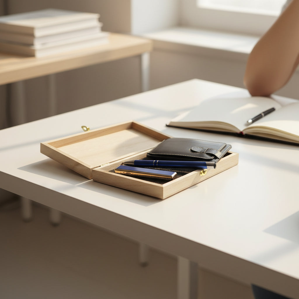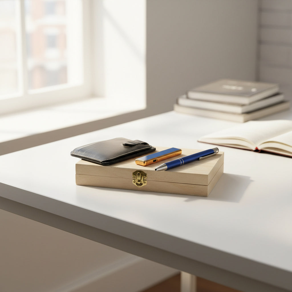 İsme özel tasarlanabilen deri kartlık, şarjlı USB çakmak ve mavi tükenmez kalemden oluşan şık hediye seti.