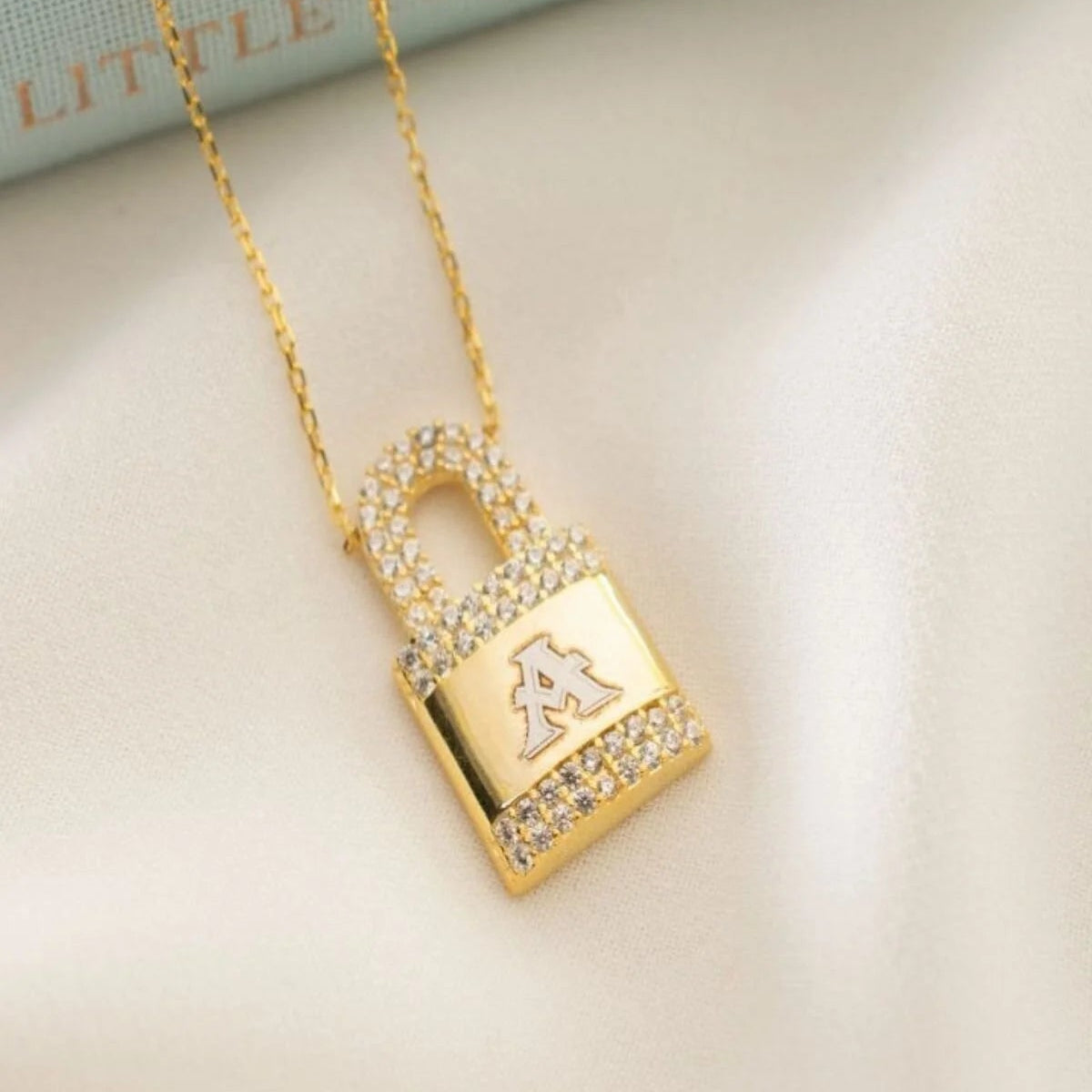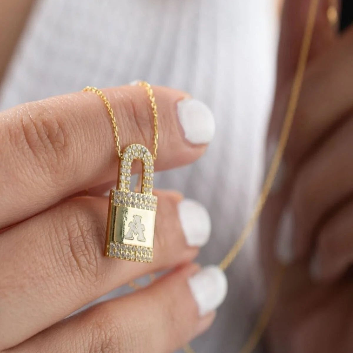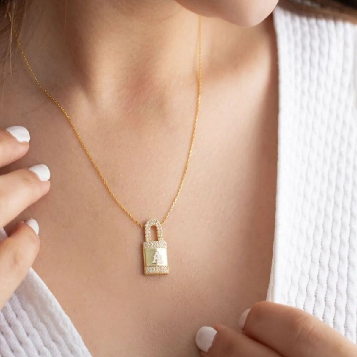 Zirkon taşlarla süslenmiş, kişiye özel harf detaylı altın kaplama kilit kolye ile stilinize şıklık katın.