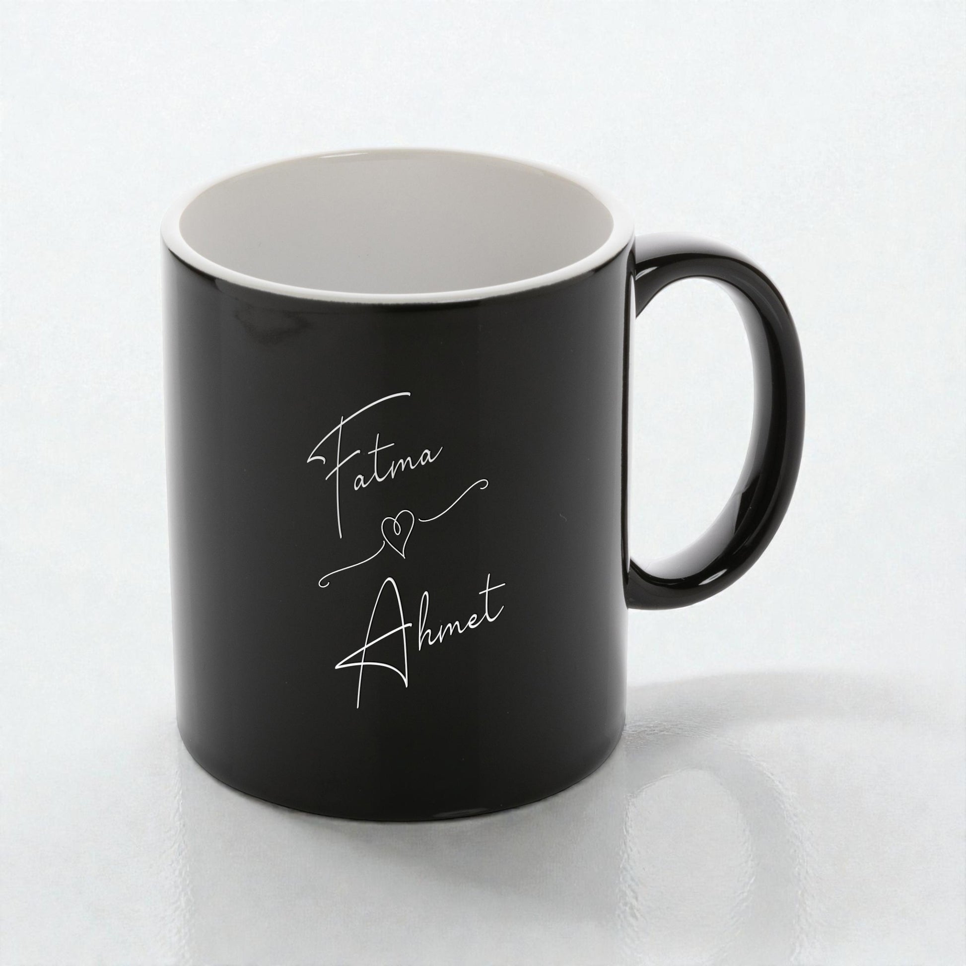 Sevgilinizin adıyla tasarlanmış şık ve romantik siyah kupa – kalbiniz bir arada!