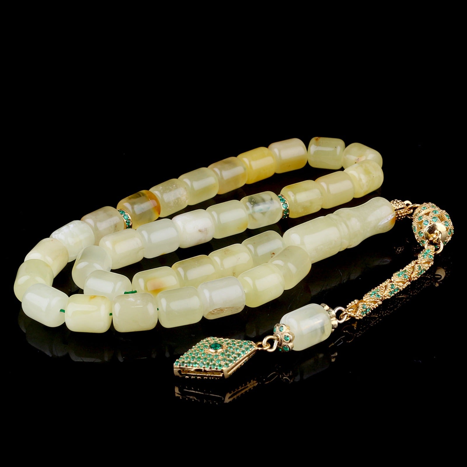 Zirkon taşlı gümüş püsküllü, orijinal ve sertifikalı mat sarı damla kehribar tesbih.