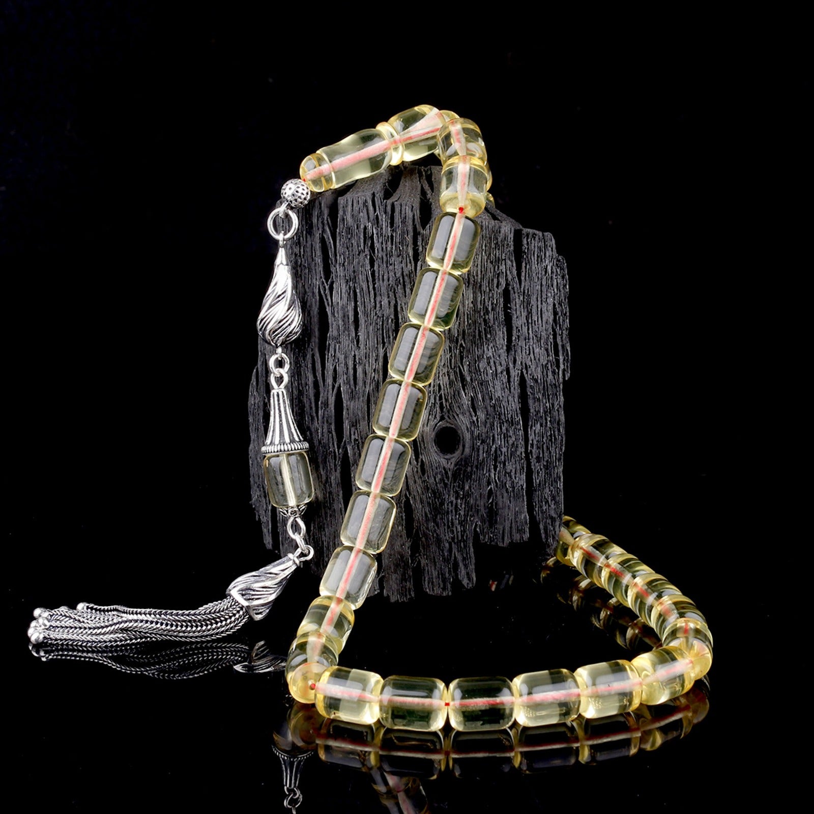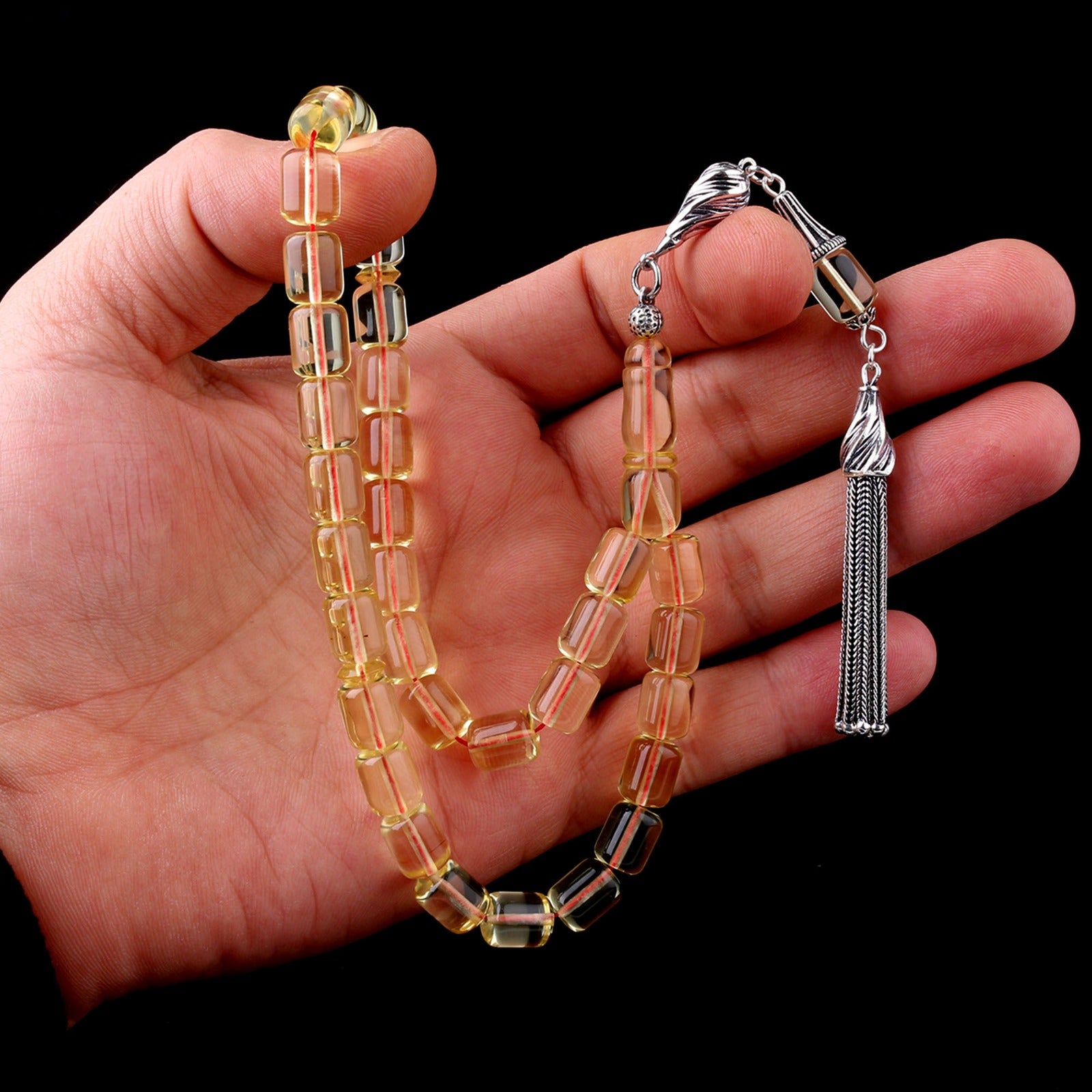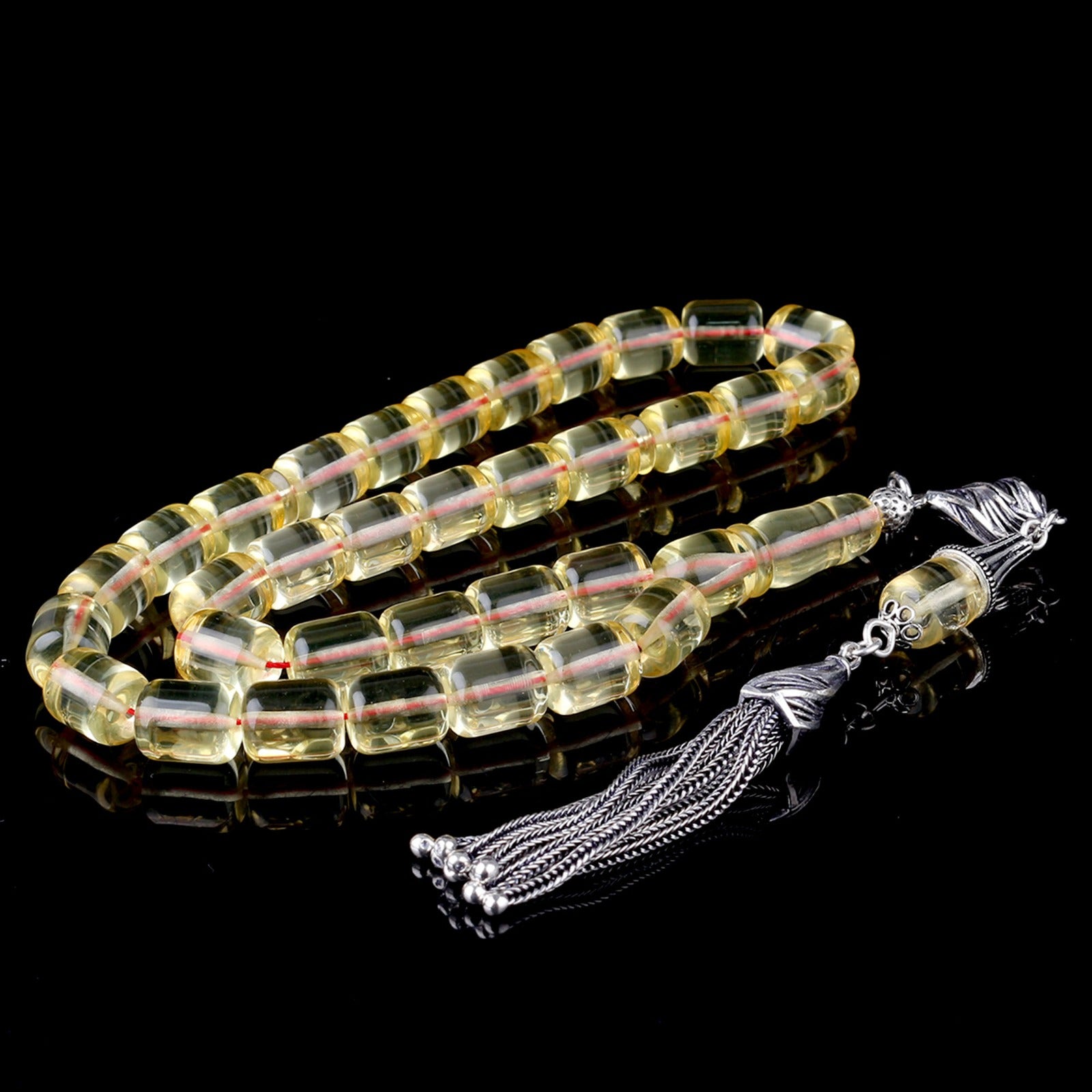 925 ayar gümüş püsküllü, orijinal ve sertifikalı şeffaf sarı damla kehribar tesbih.