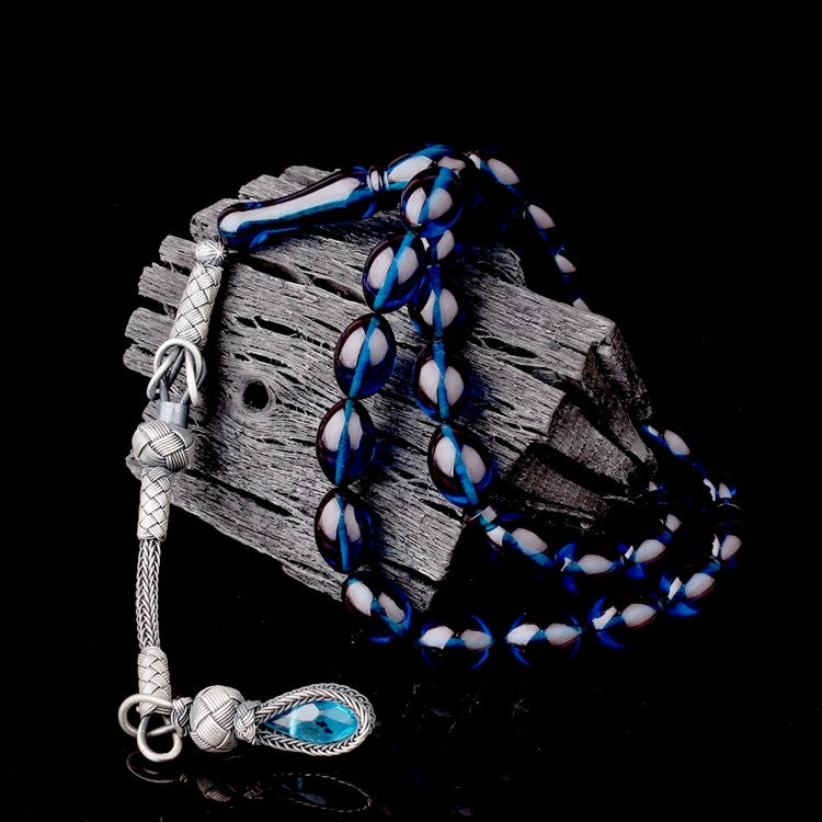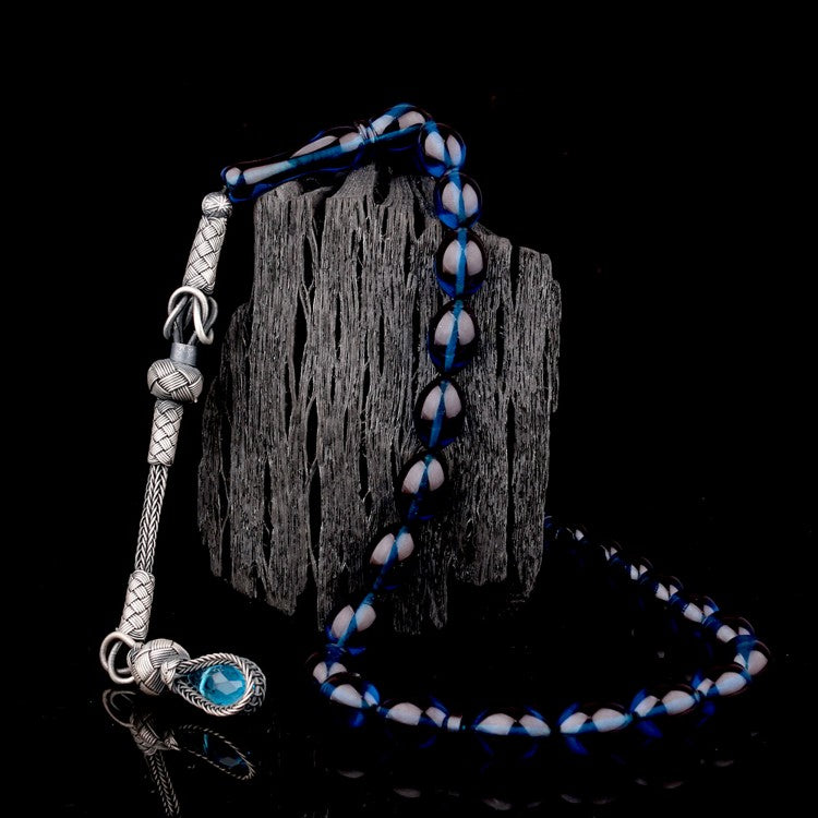 1000 Ayar Gümüş Püsküllü Arpa Kesim Mavi Ateş Kehribar Tesbih