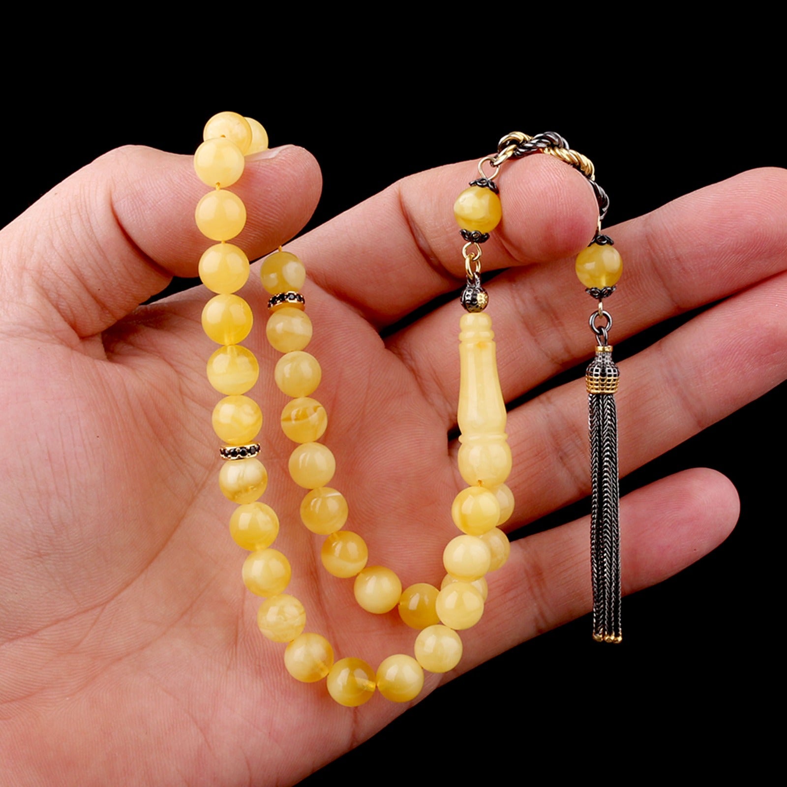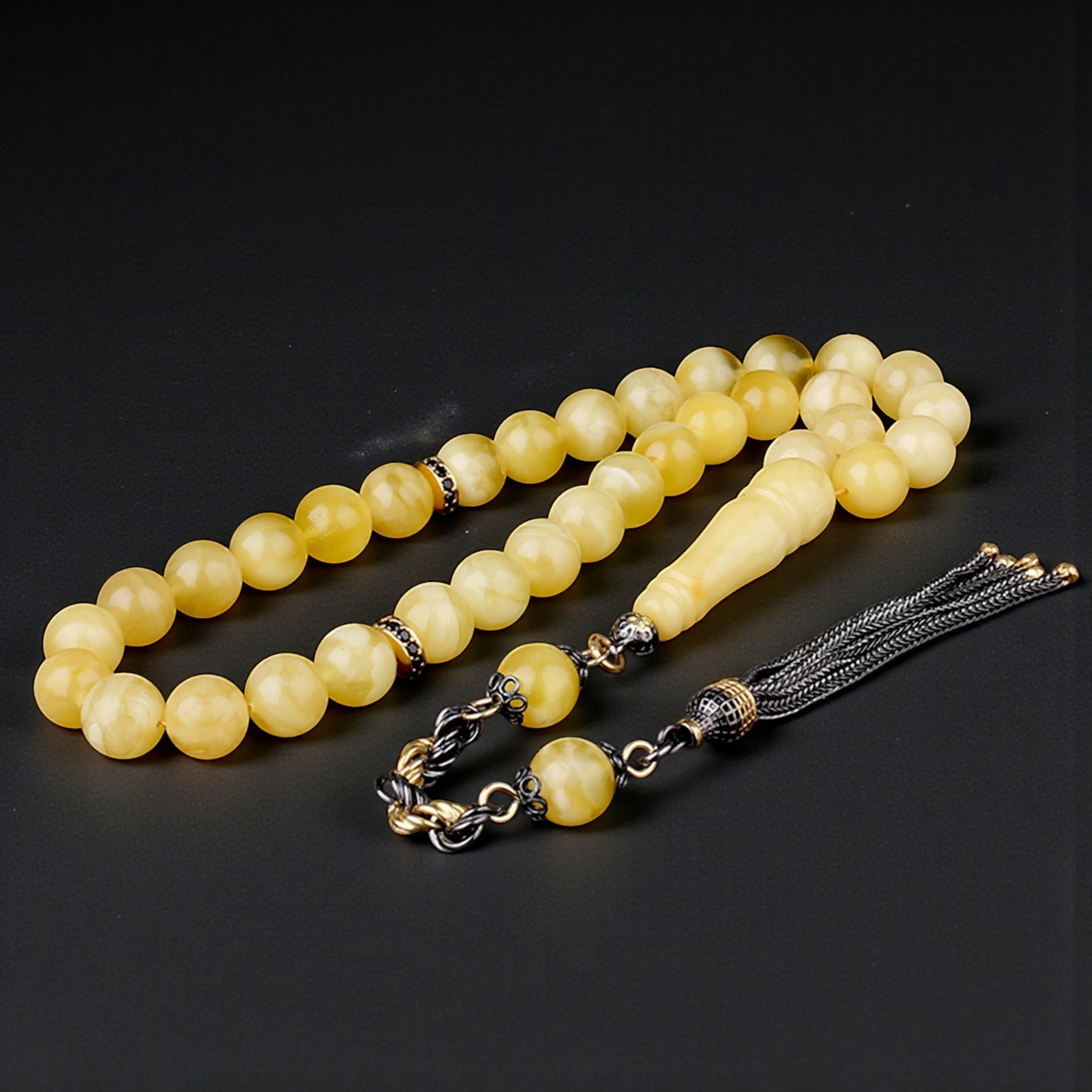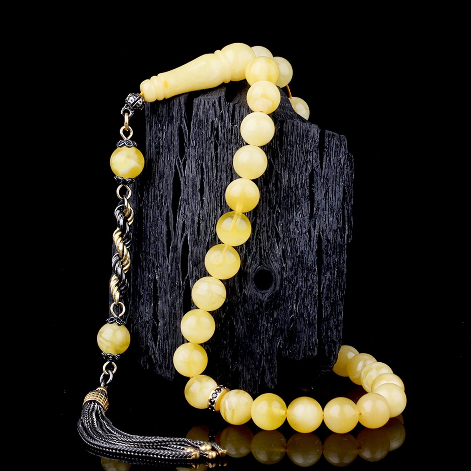Orijinal sertifikalı, küre kesim 925 ayar gümüş püsküllü damla kehribar tesbih.