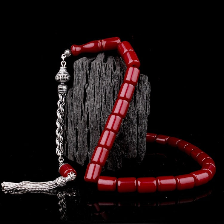 925 Ayar Gümüş Püsküllü Kesme Model Bordo Ateş Kehribar Tesbih