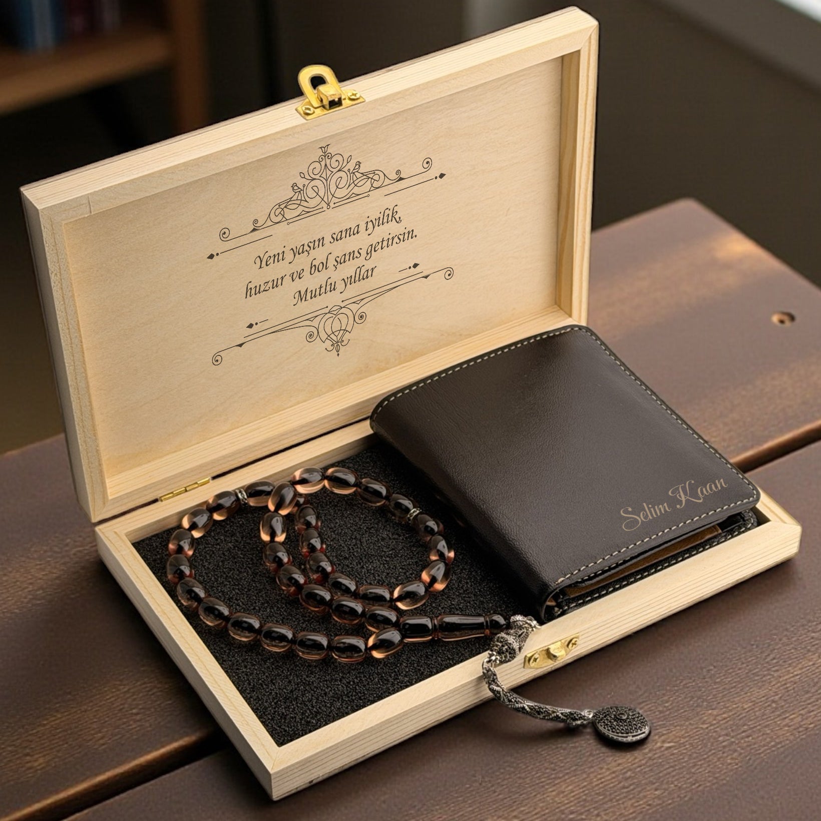 Deri Cüzdan & Özel Kehribar Tesbih Hediye Seti