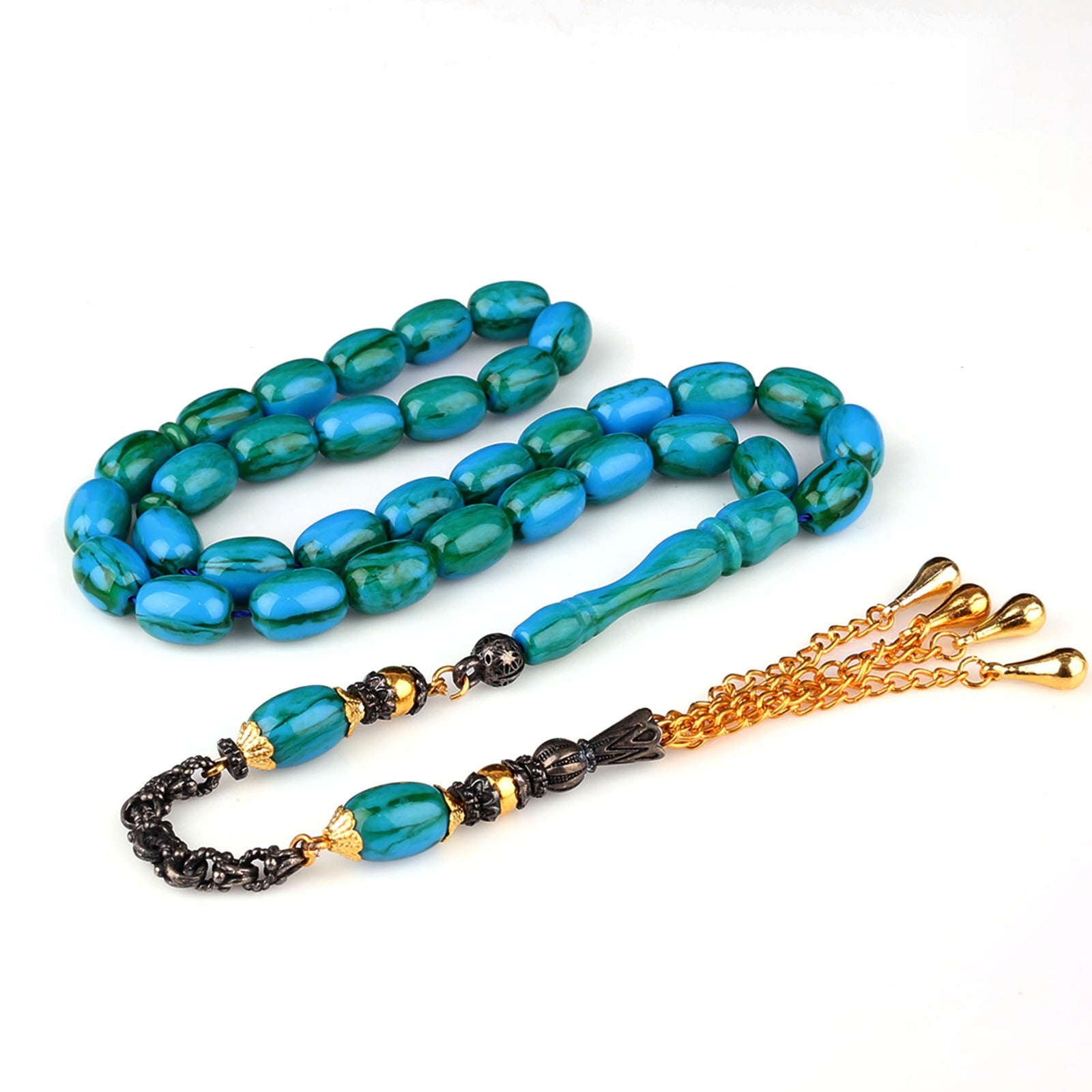 Metal bafon püsküllü, zarif ve şık görünüme sahip mavi-yeşil tonlarda sıkma kehribar tesbih.