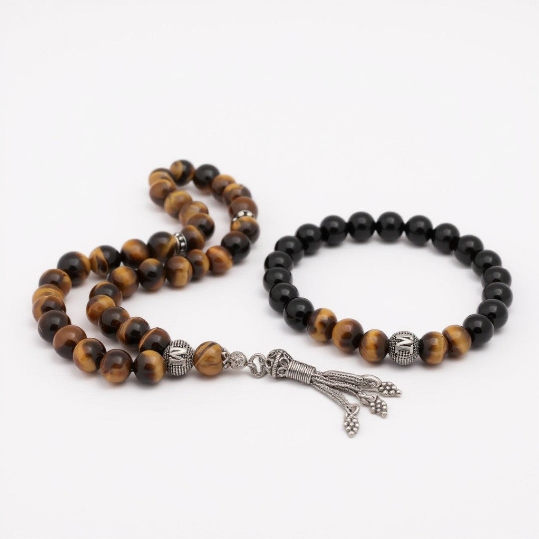 Combinaison de perles de prière et de bracelet en pierre naturelle œil de tigre avec lettres