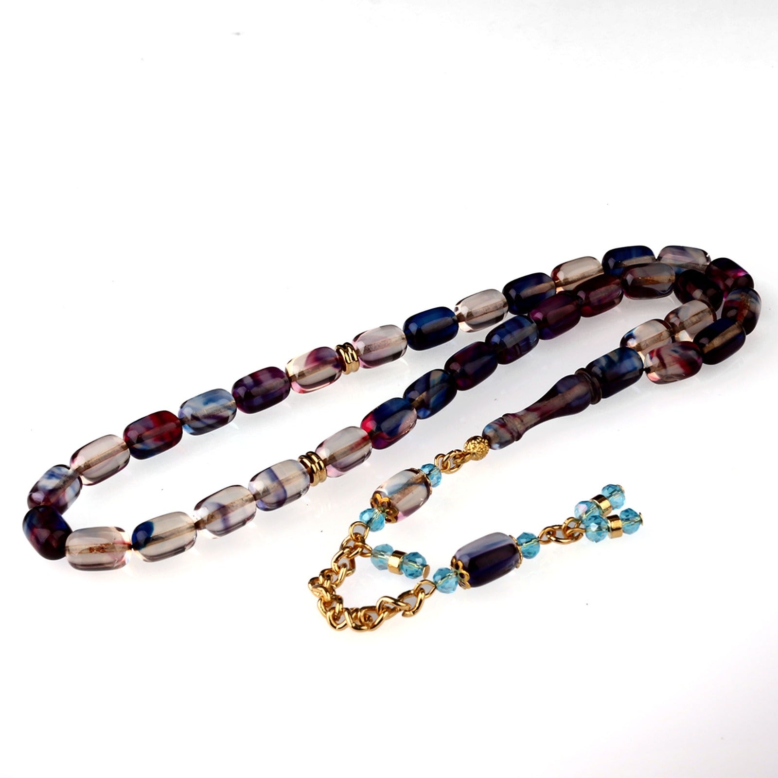 Ebruli Ateş Kehribar Tesbih Metal Parçalı Püskül (Turkuaz Kristalli)