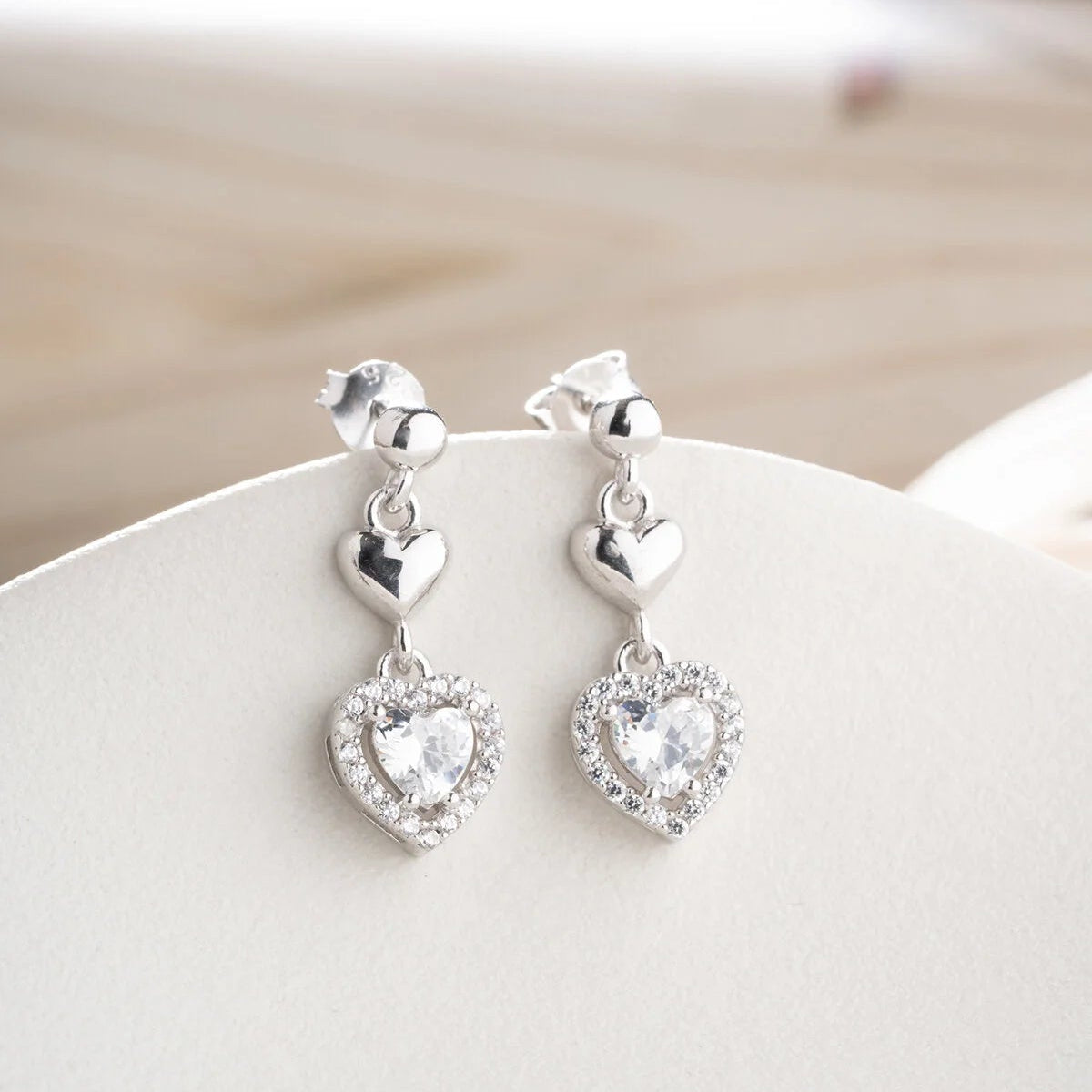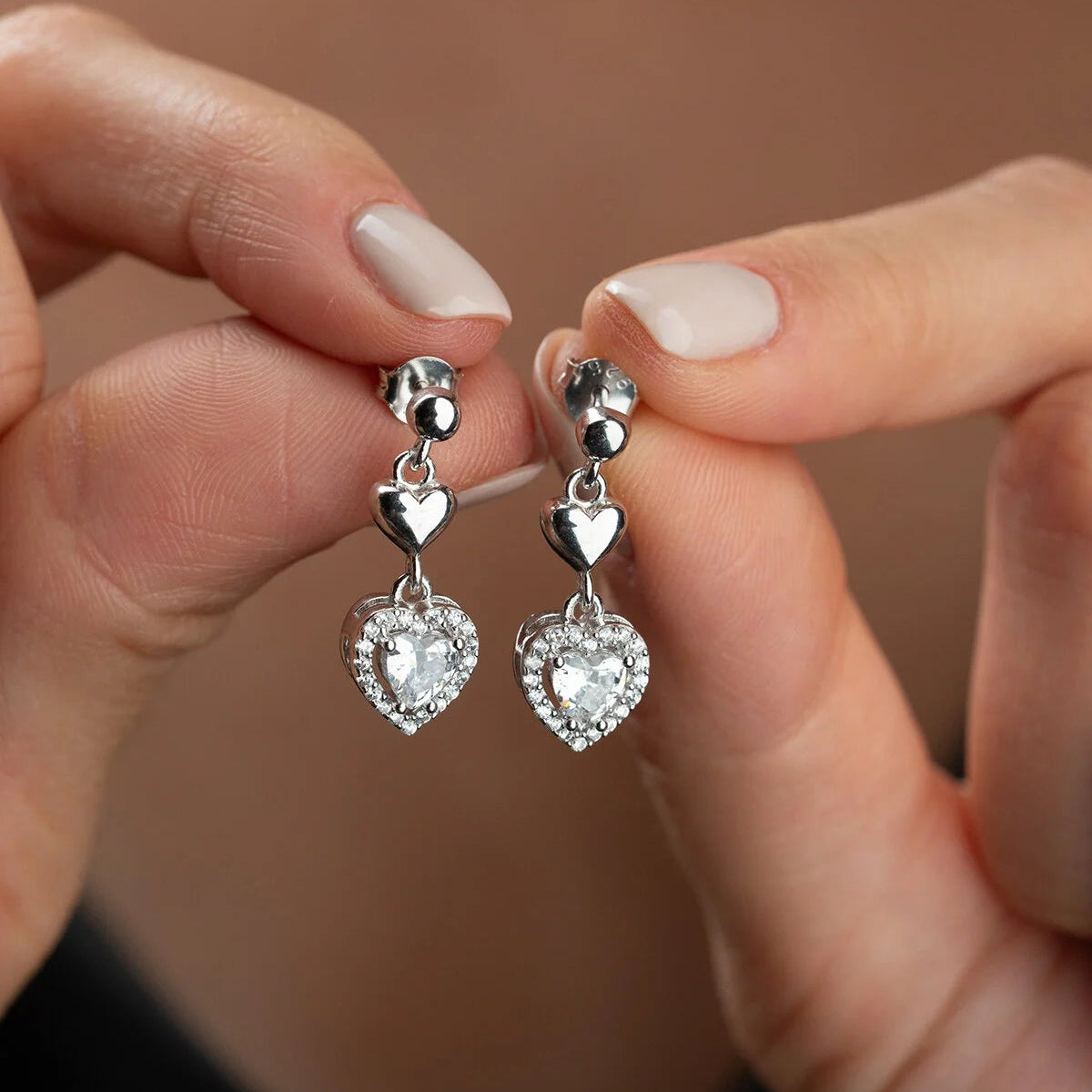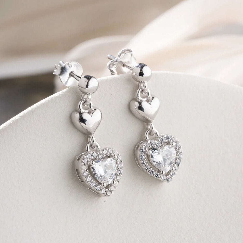 925 ayar gümüşten üretilmiş, kalp formunda taşlı zarif sallantılı küpe modeli.