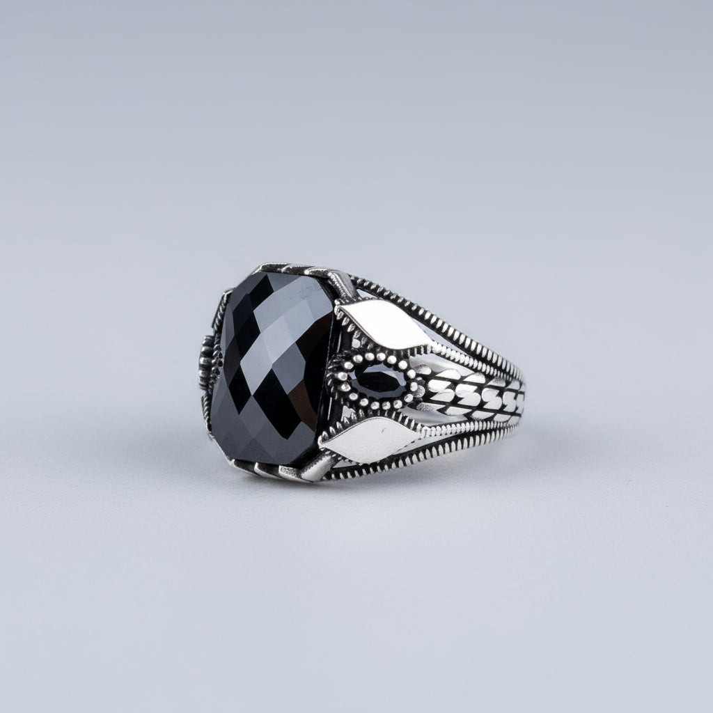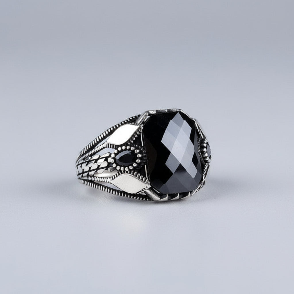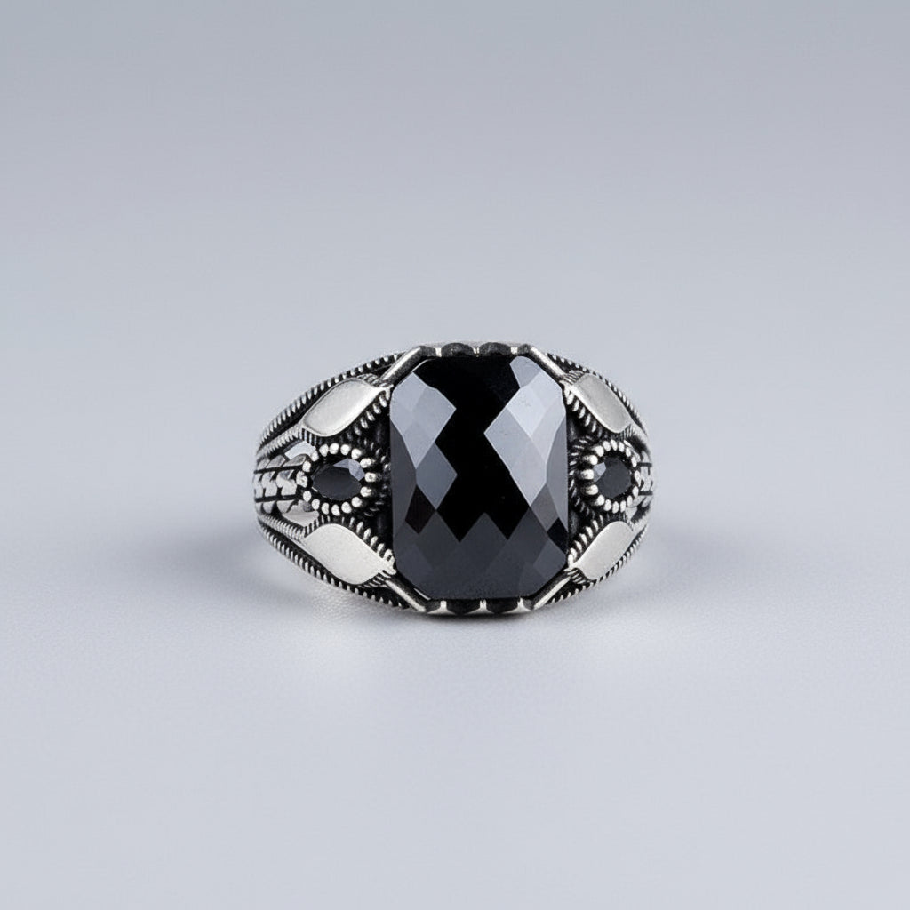 Güçlü duruşu ve asil tasarımıyla dikkat çeken siyah taşlı 925 ayar gümüş erkek yüzük.