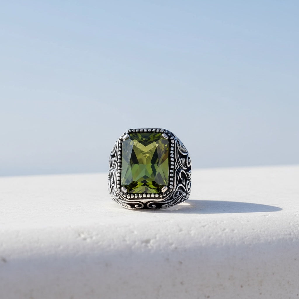 Haki renkte zirkon taşıyla dikkat çeken 925 ayar gümüş otantik erkek yüzük.