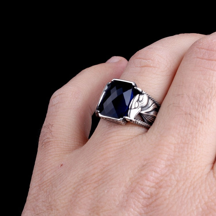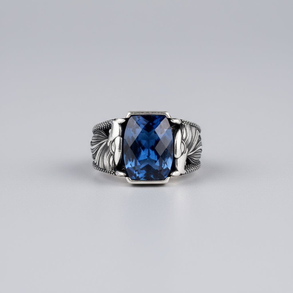 Gücün ve özgürlüğün simgesi kartal motifiyle tasarlanmış, mavi taşlı özel gümüş erkek yüzük.