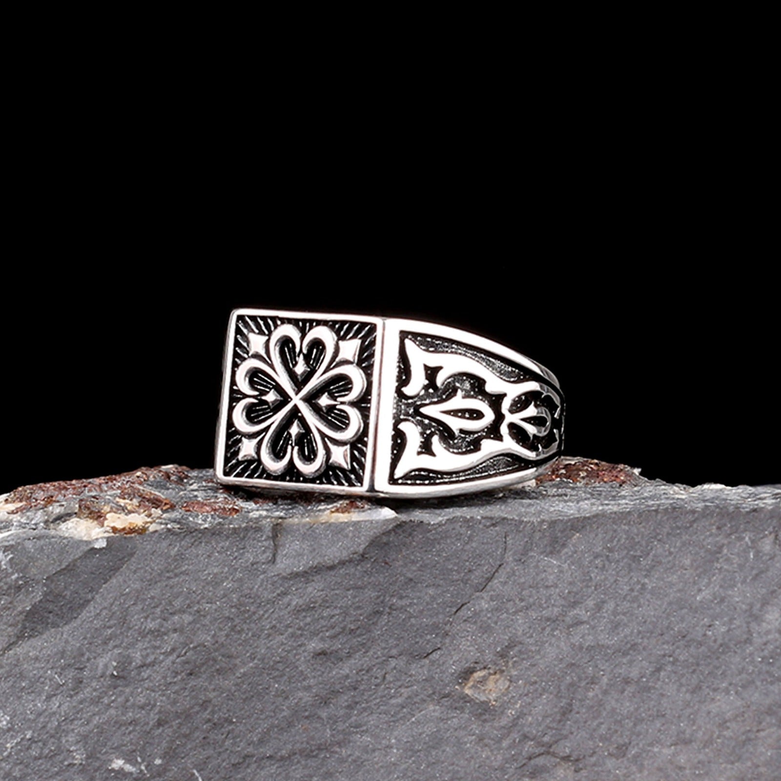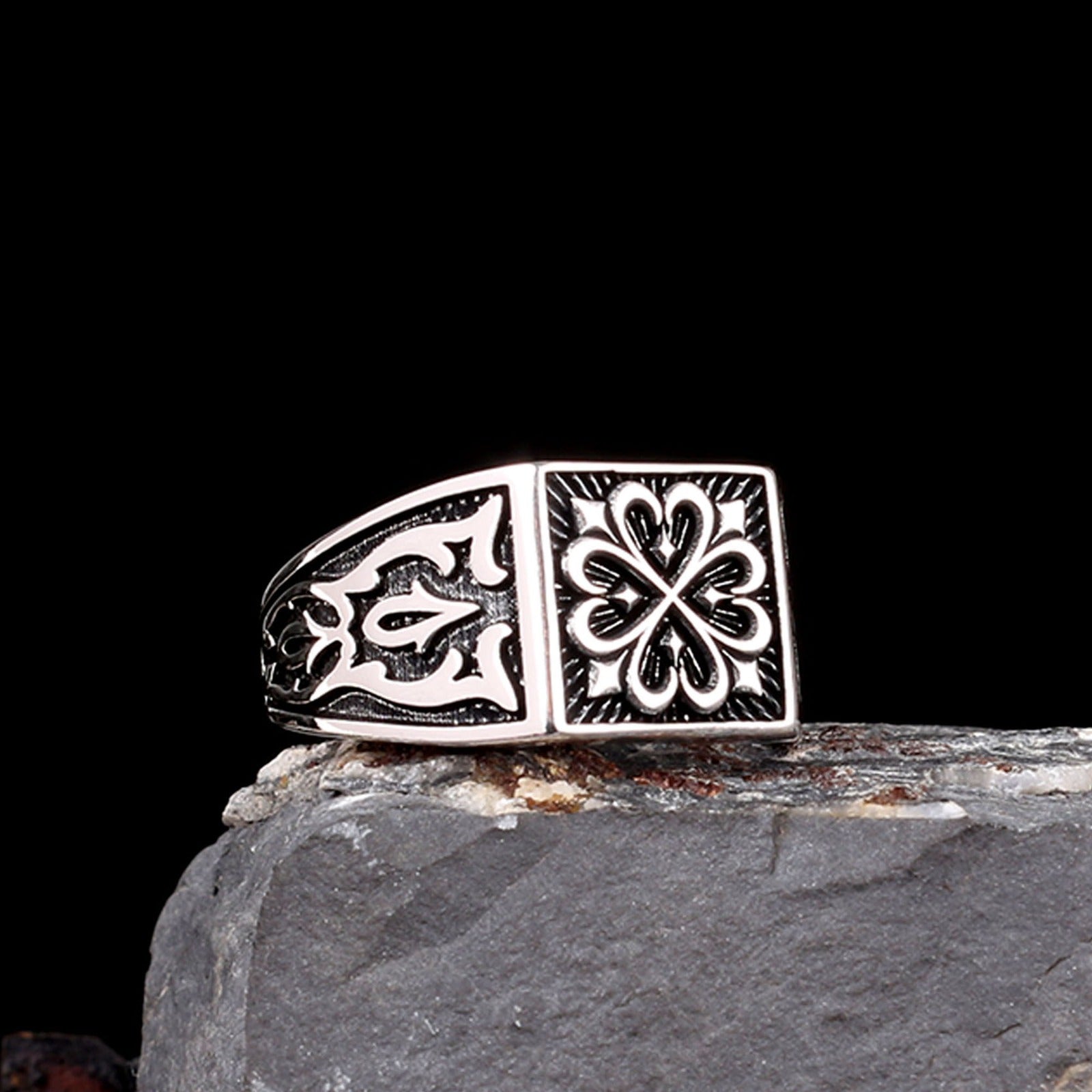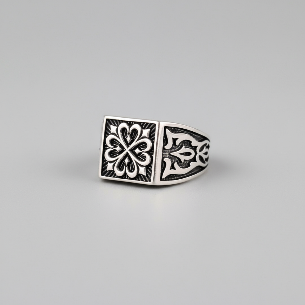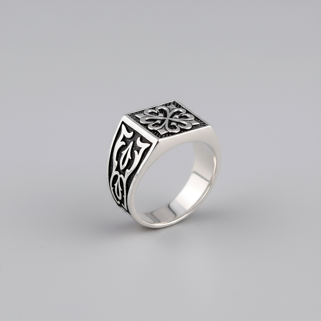 Selçuklu motiflerinden ilham alınarak tasarlanmış, siyah detaylı kare yüzeyli 925 ayar gümüş erkek yüzük. VARQ Koleksiyonu'nun karakteristik çizgisini yansıtır.