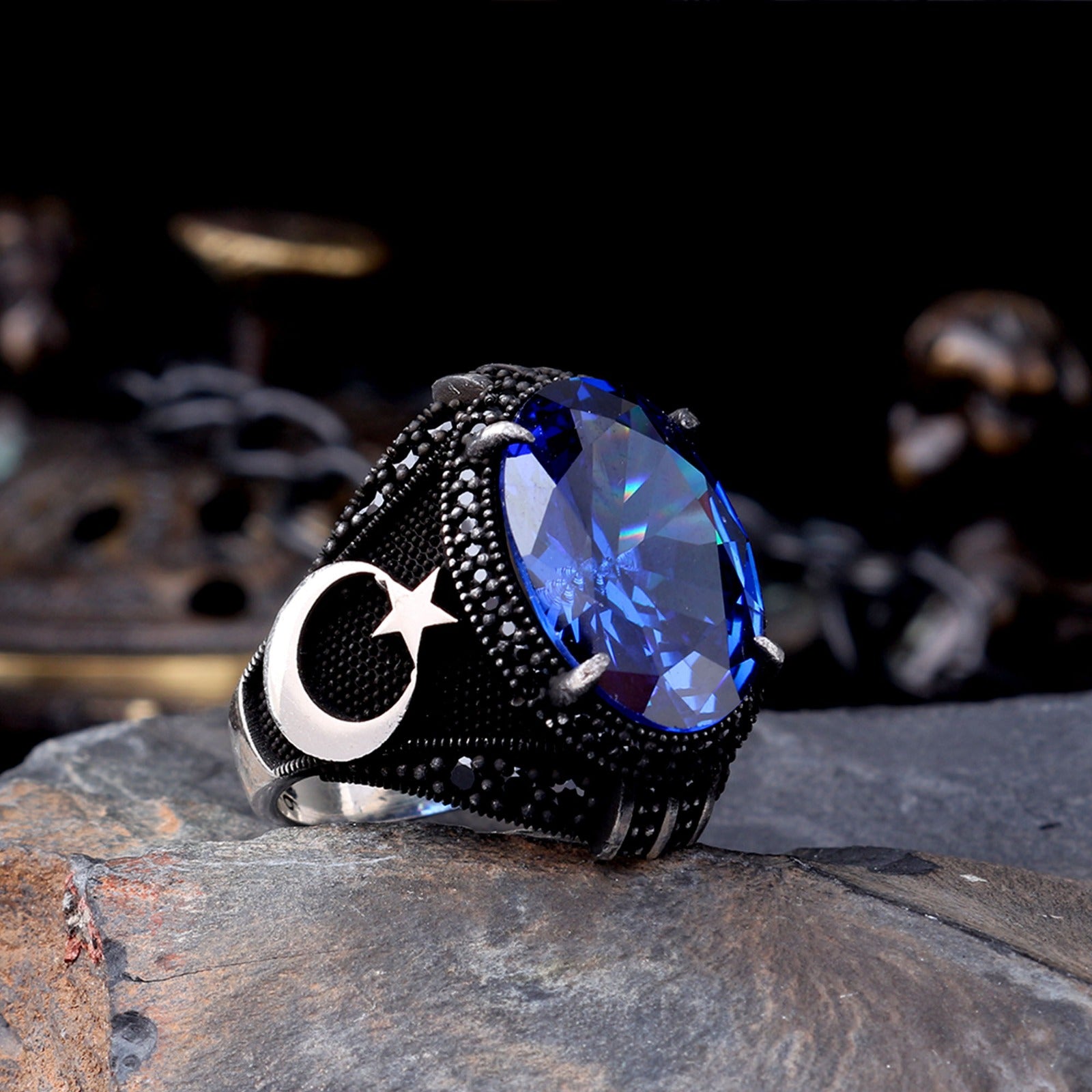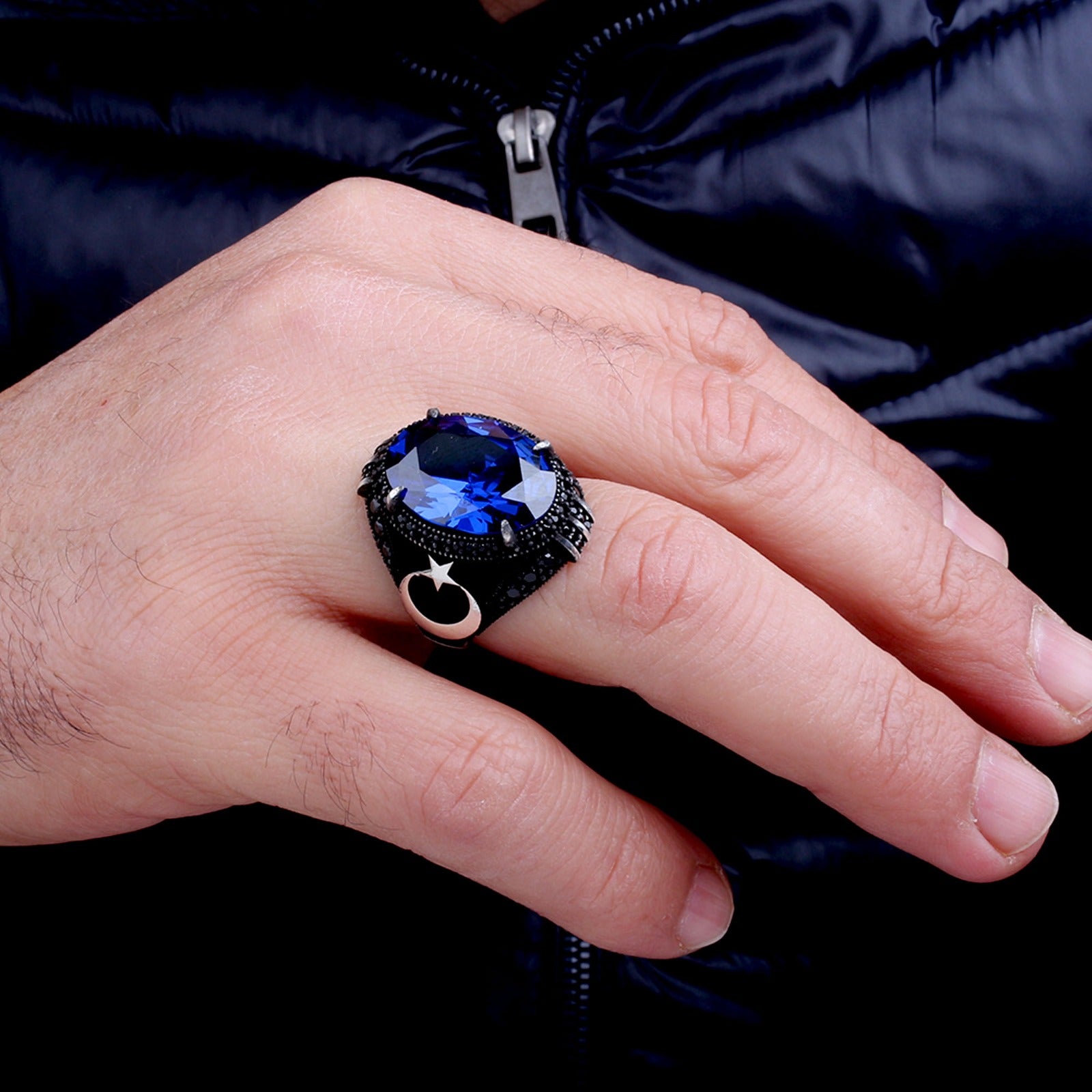 Derin lacivert zirkon taşın ışıltısıyla göz kamaştıran, 925 ayar gümüşten üretilmiş özel tasarım erkek yüzük.