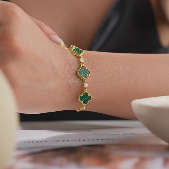 Dört adet doğal malakit taşıyla süslenmiş zarif yonca motifleri, bileğinizde göz alıcı bir şıklık sunar!