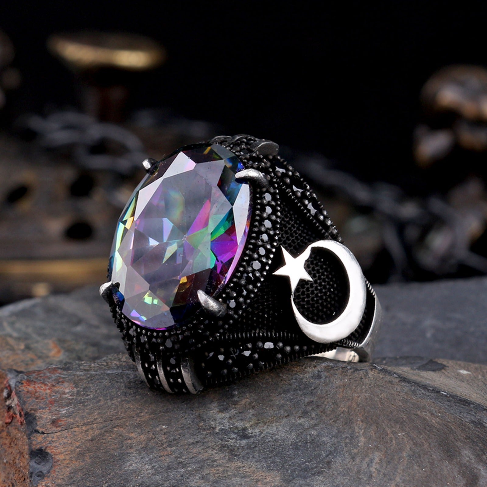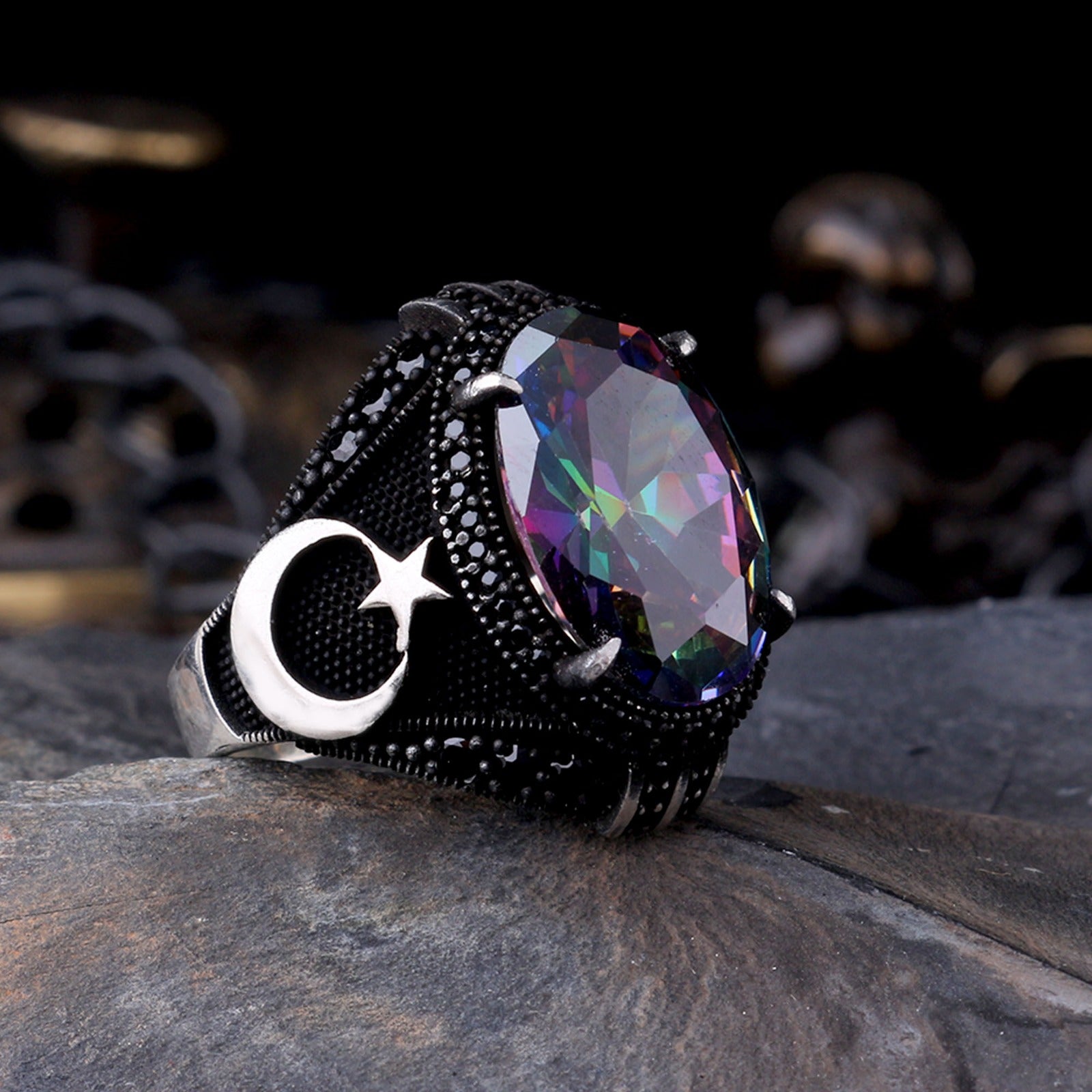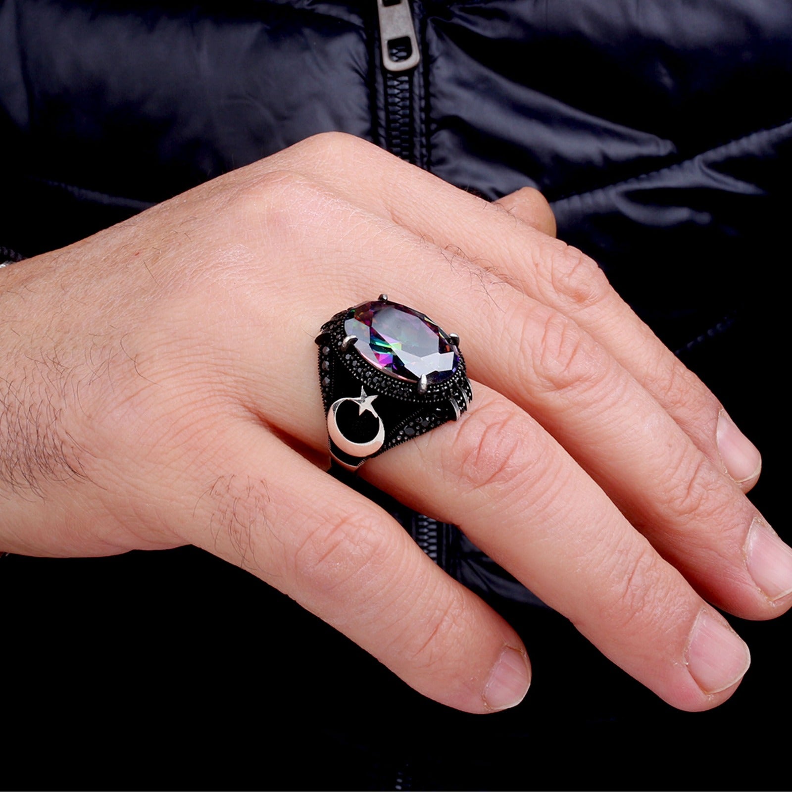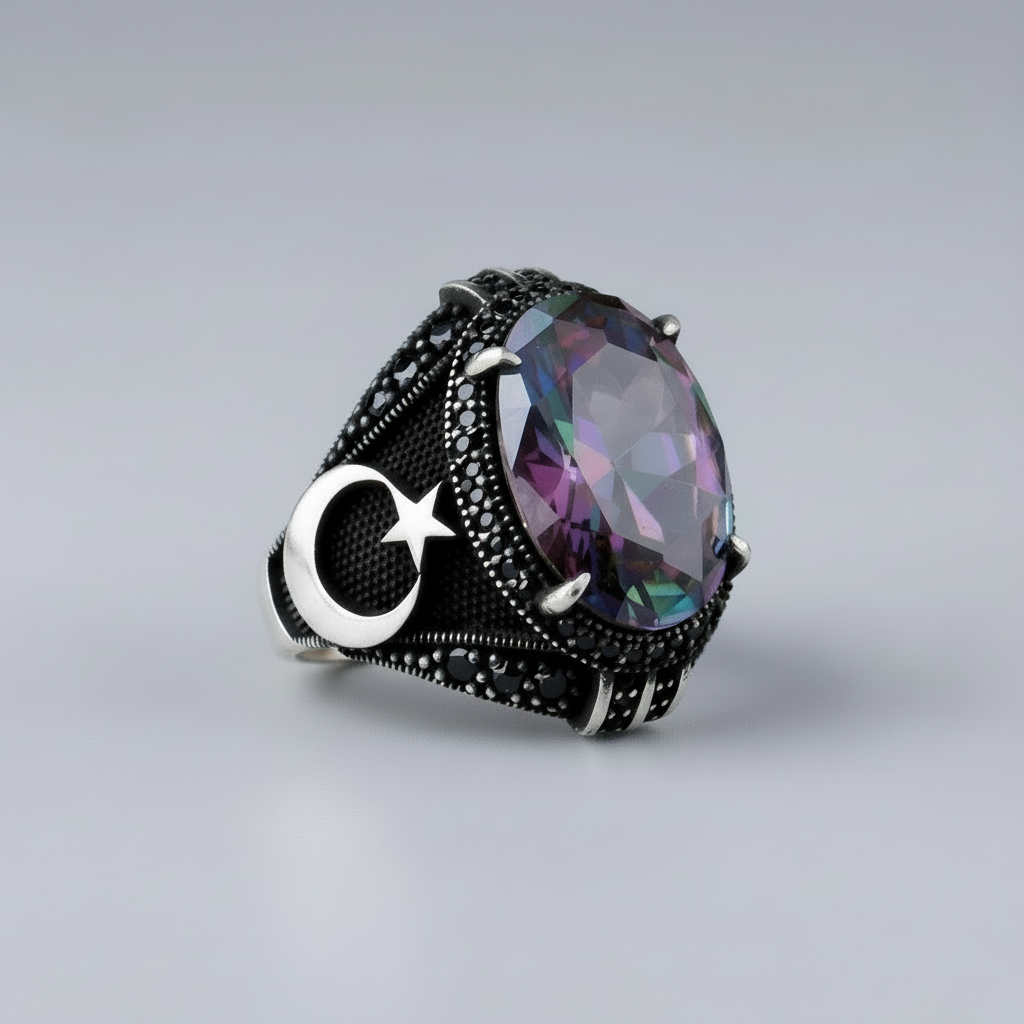 Işıkla renk değiştiren mistik topaz taşı ve güçlü ayyıldız motifi ile tasarlanmış, el işçiliği 925 ayar gümüş erkek yüzük modeli.