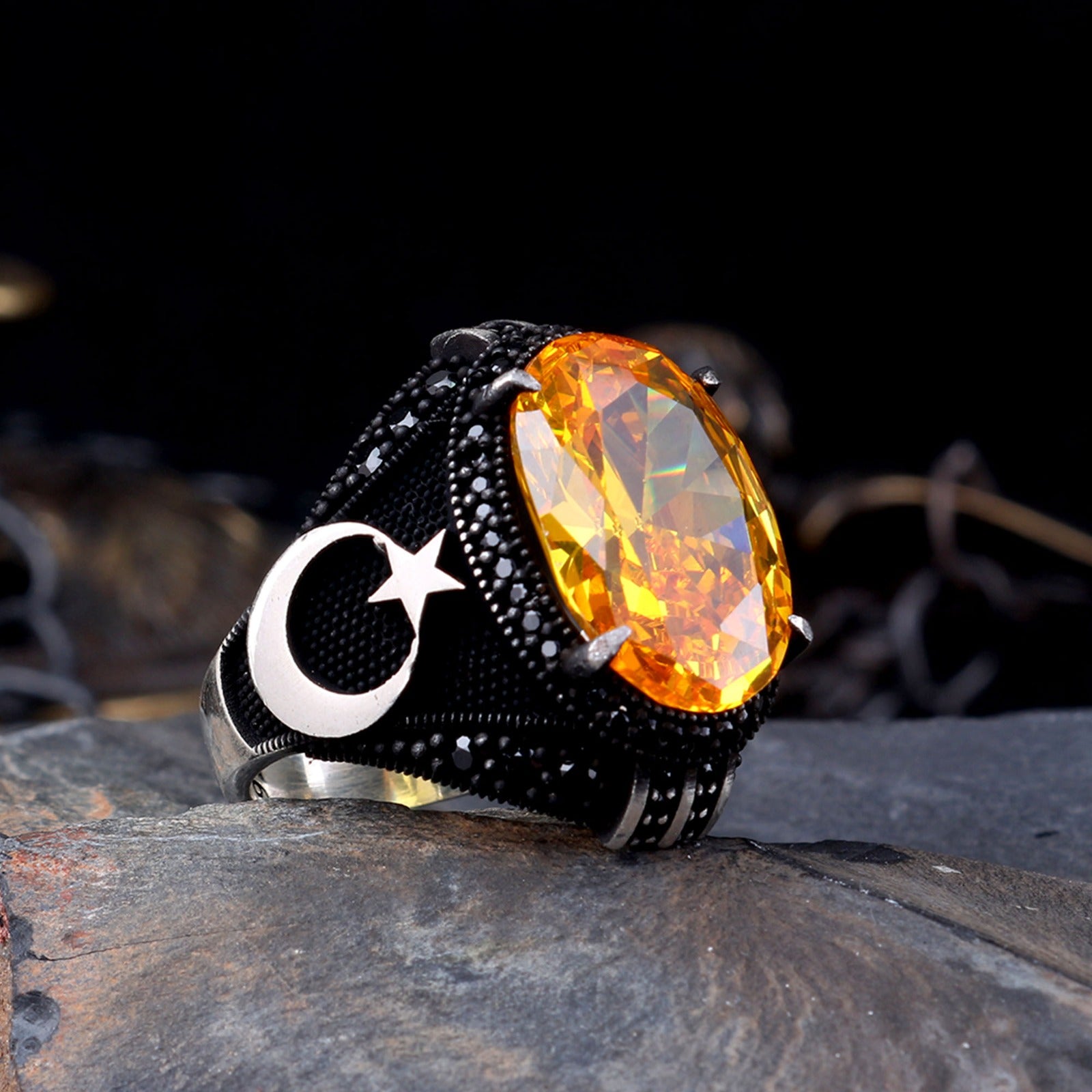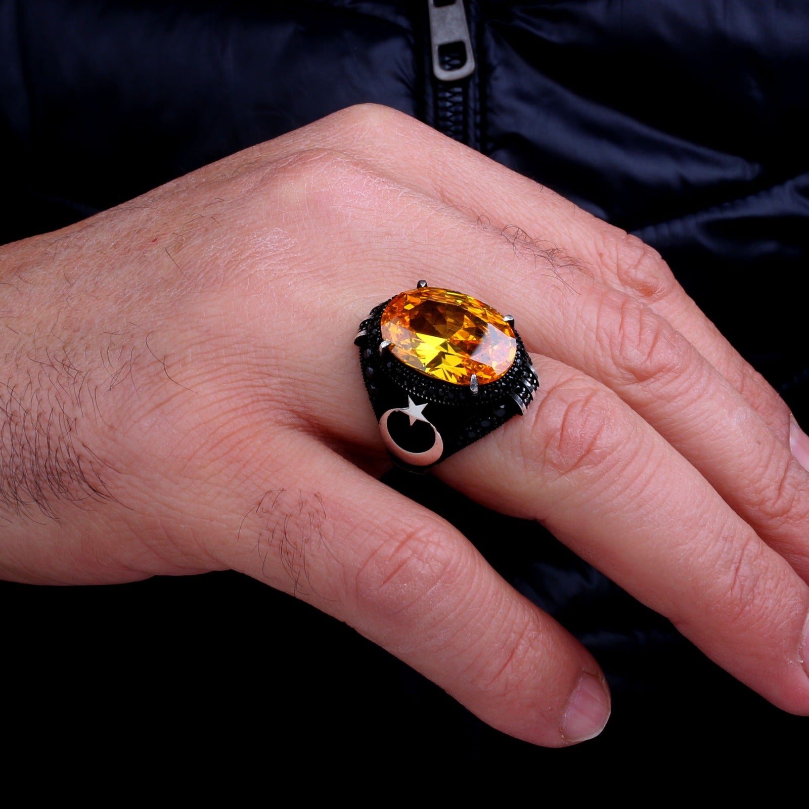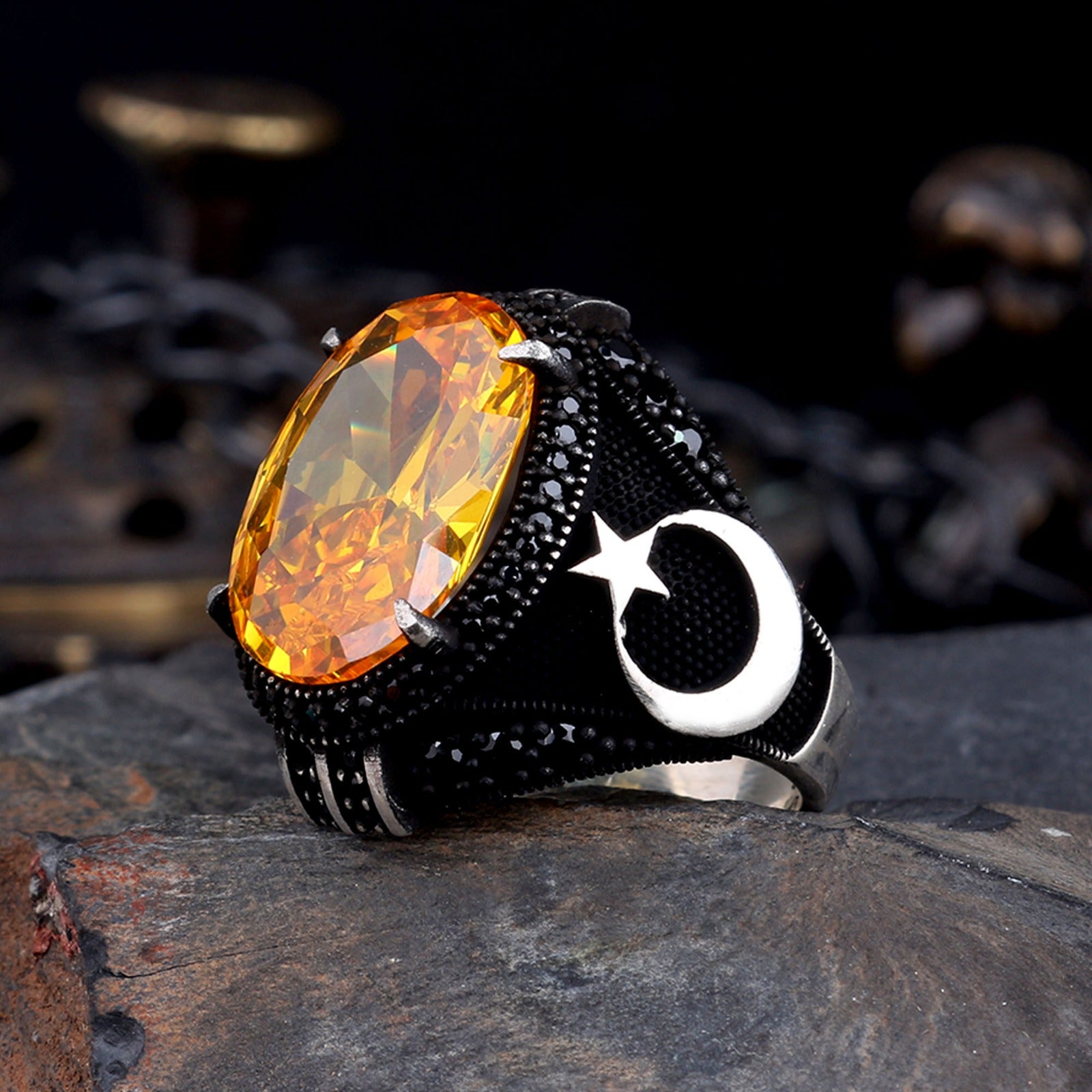 Sarı zirkon taşlı, Ayyıldız motifli, 925 ayar gümüşten el işçiliği ile üretilmiş şık erkek yüzüğü.