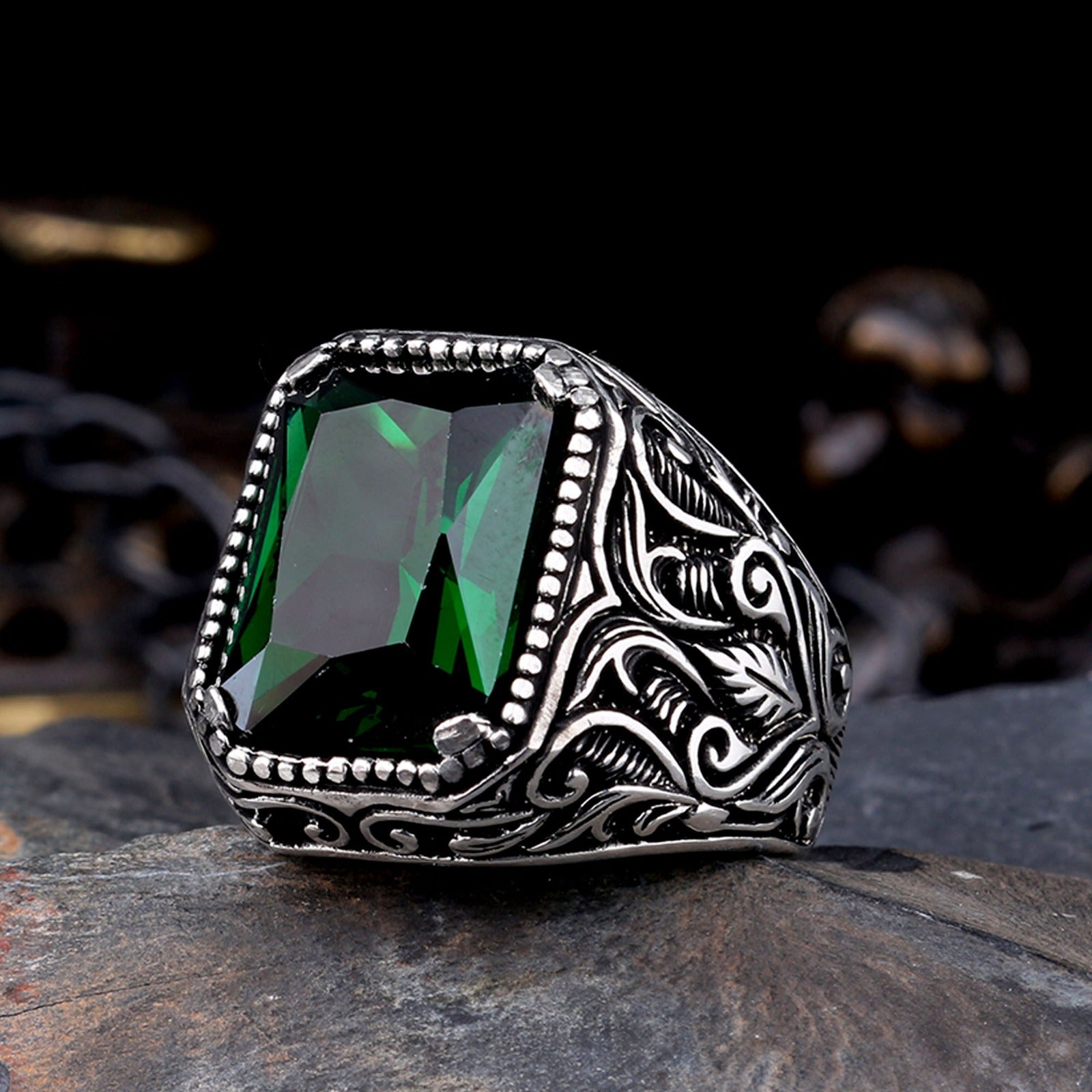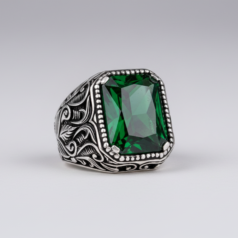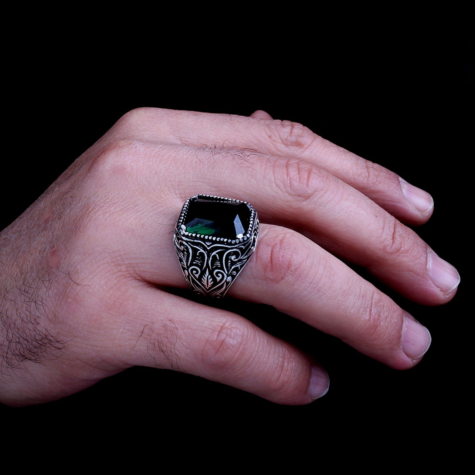 Zarif işlemeleri ve göz alıcı yeşil zirkon taşı ile dikkat çeken 925 ayar gümüş erkek yüzük.