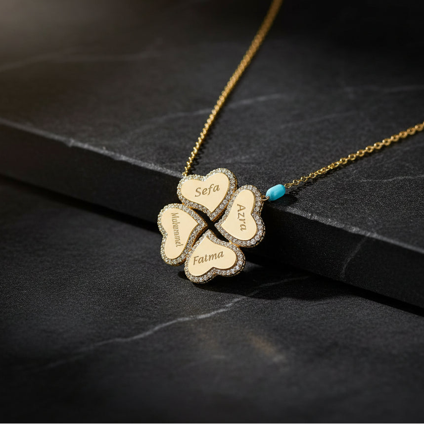 Anneye özel isimli aile yoncası kolye, çocuk isimleri ve zarif taşlı detaylarıyla Anneler Günü için anlamlı bir hediyedir.