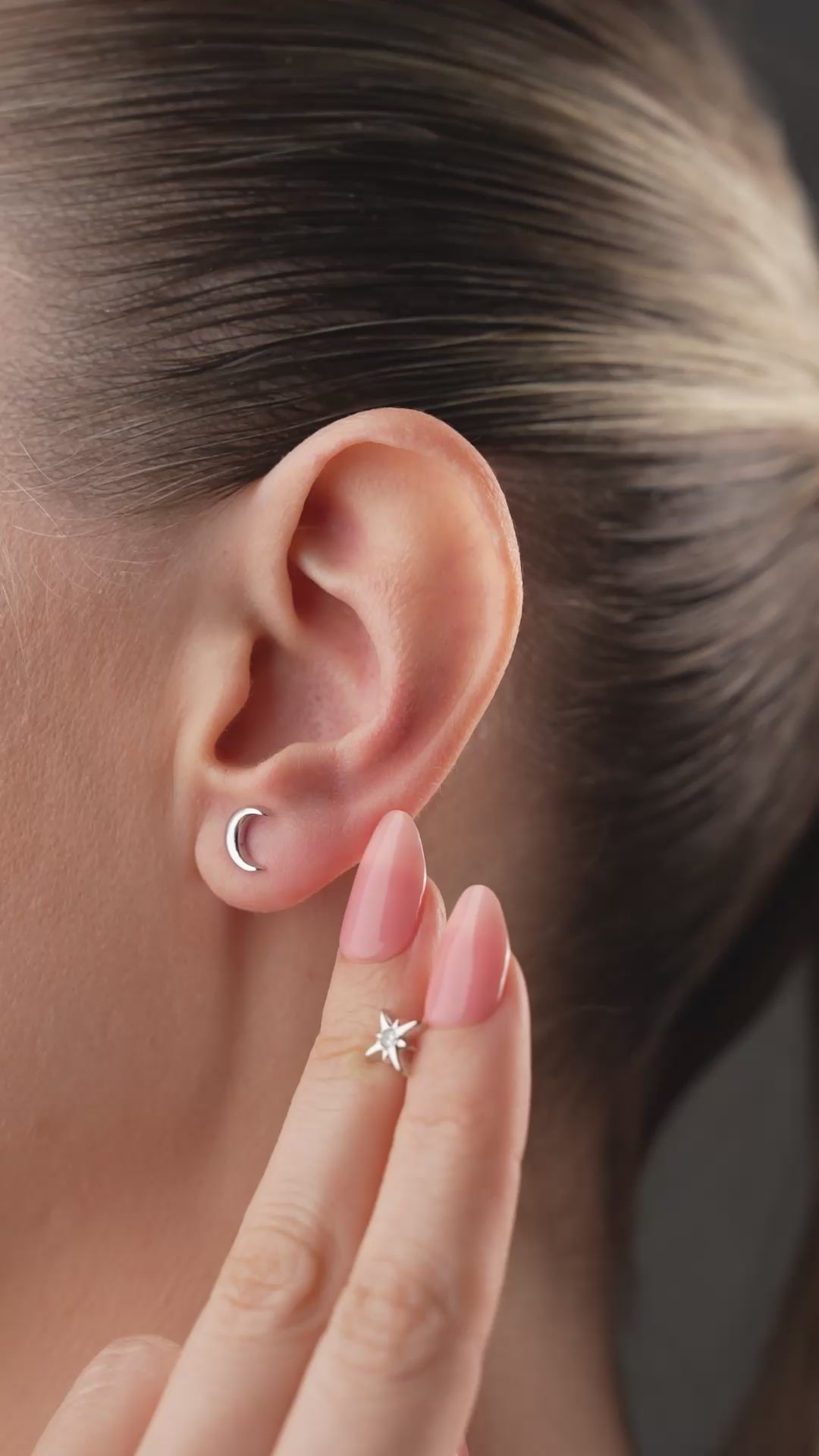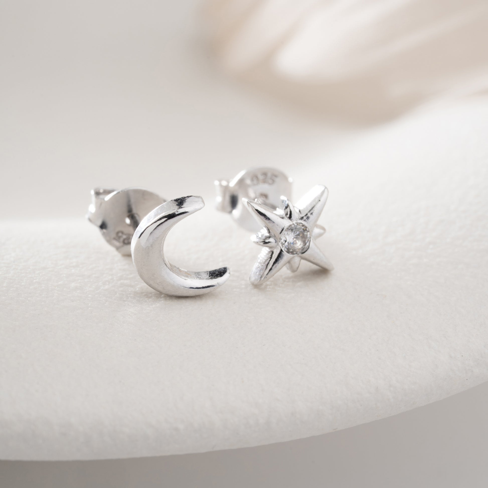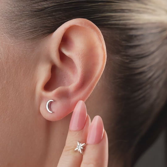 Parlak taşlı yıldız ve zarif ay figürüyle 925 ayar gümüşten şık küpe modeli.