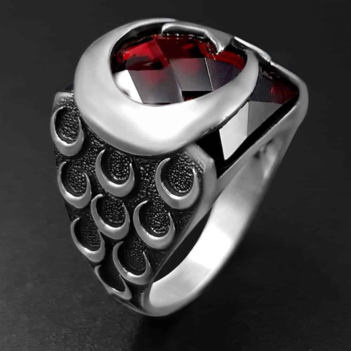 Ay Yıldız Kırmızı Taşlı Gümüş Yüzük