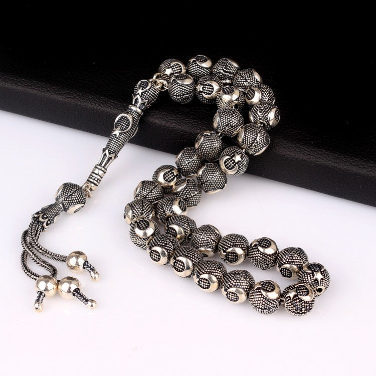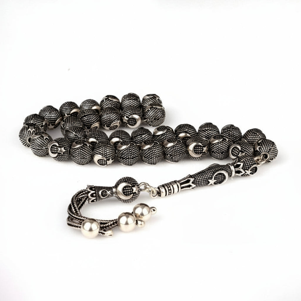 Şıklığı ve zarafeti bir araya getiren, tamamı 925 ayar gümüşten üretilmiş ayyıldız motifli özel tasarım tesbih.