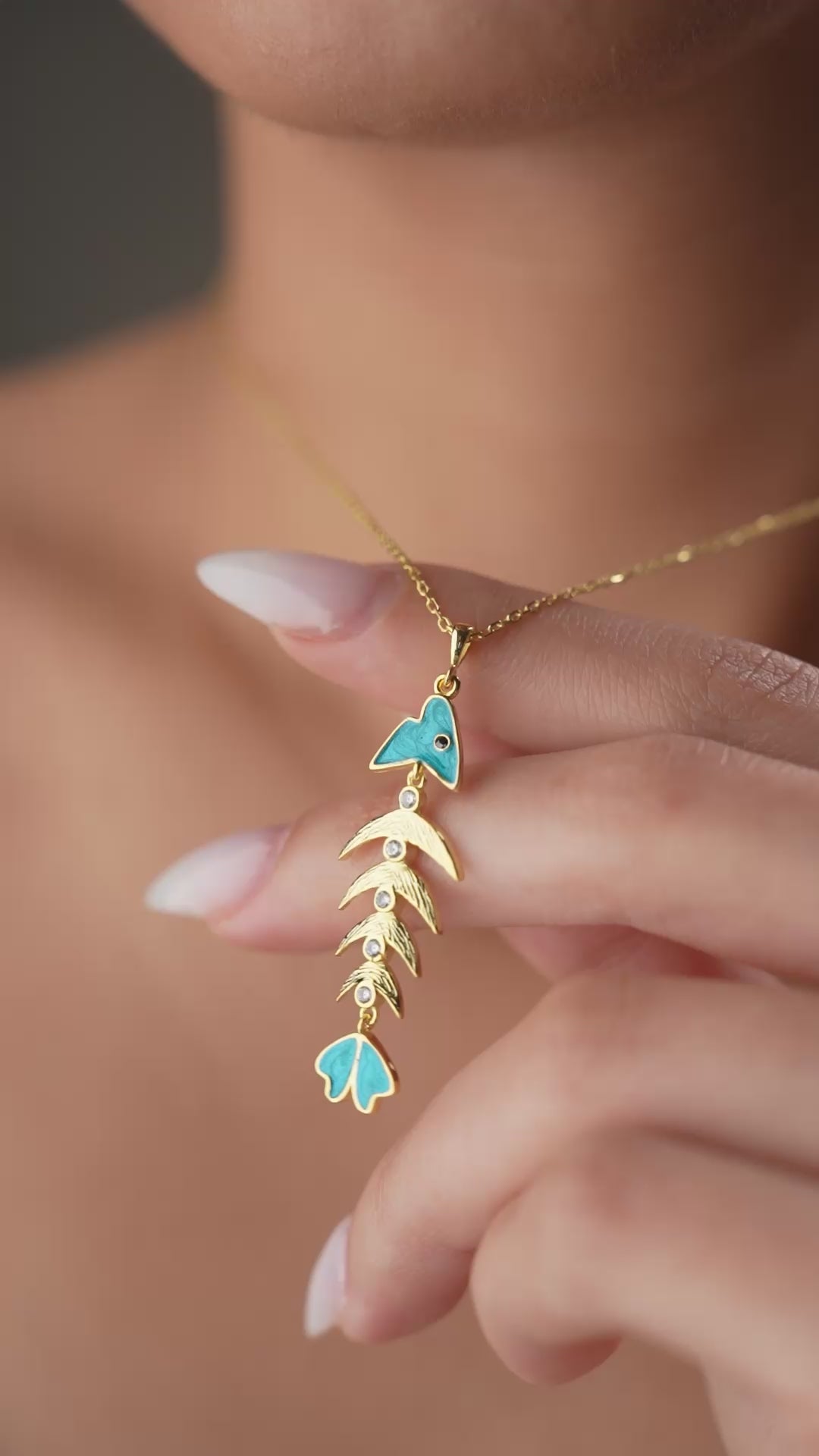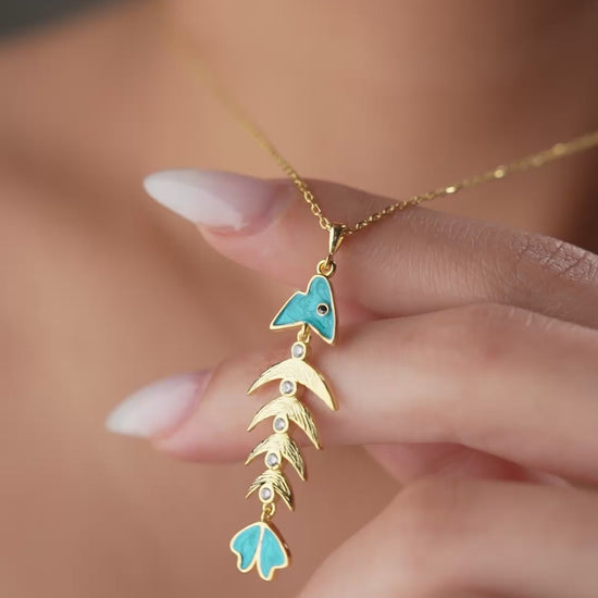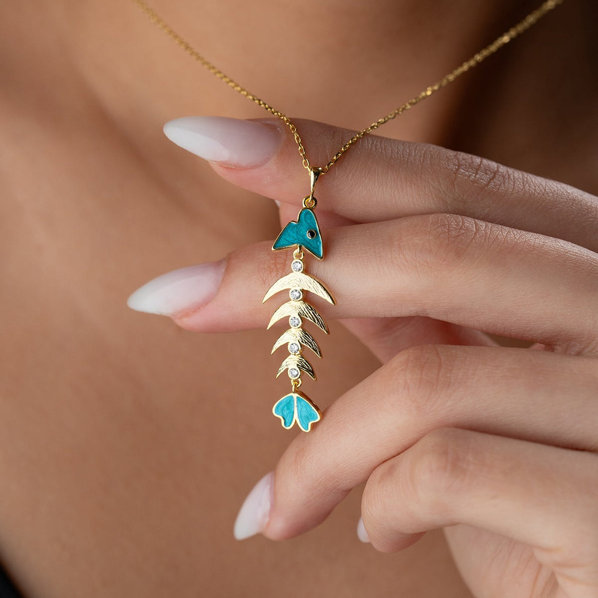 Turkuaz mine ve zirkon taş detaylı, altın kaplama 925 ayar balık iskeleti kolye.